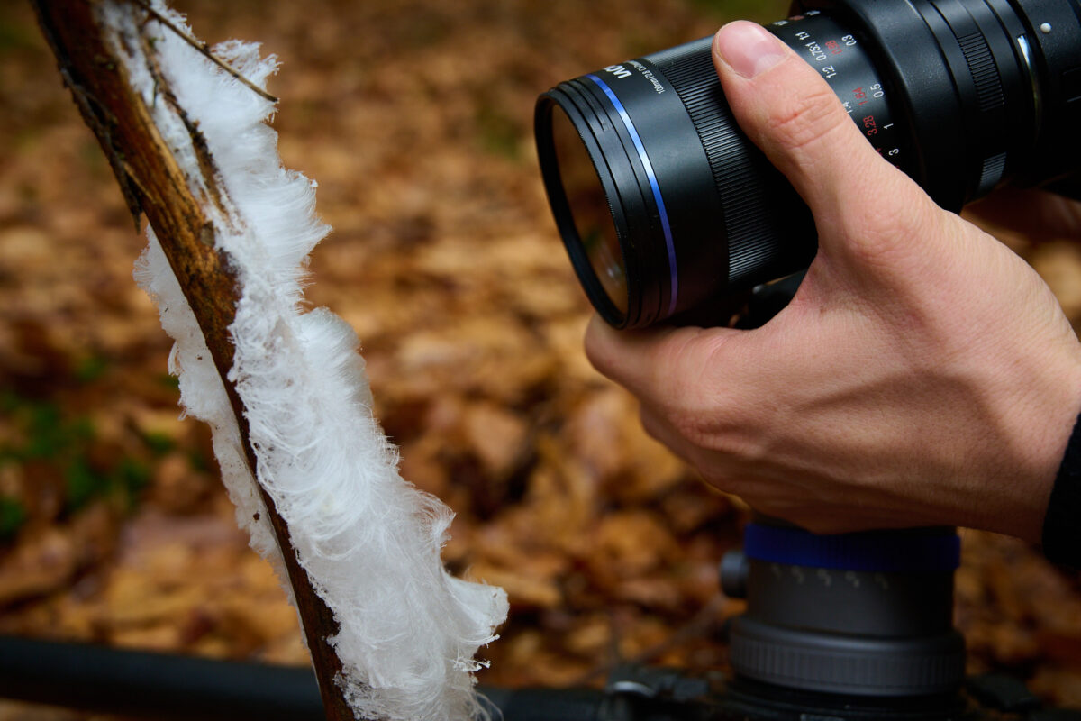 Mit der Nikon Z8 und dem Laowa 100 mm Macro ließ sich die filigrane Struktur des Haareises präzise herausarbeiten. Ein stabiles Stativ ist dabei obligatorisch: niedrige ISO-Werte für maximale Bildqualität, längere Verschlusszeiten für ausreichend Belichtung, Spiegelvorauslösung oder Selbstauslöser, um jede Erschütterung zu vermeiden. Bei der Belichtung ist Präzision gefragt – leicht nach rechts korrigiert, damit das Eis wirklich weiß bleibt und nicht ins Graue kippt.
