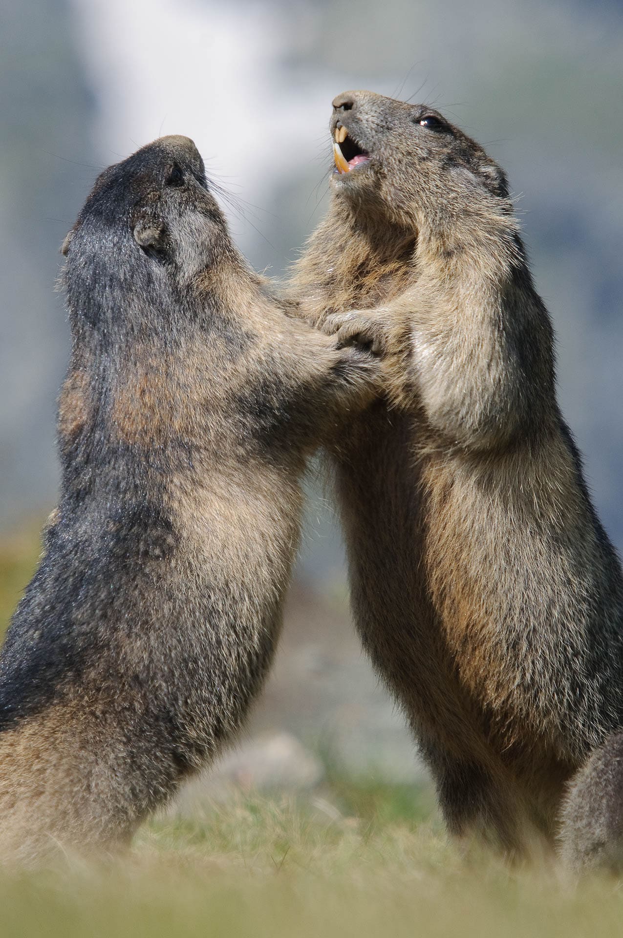 Zwei aufrecht stehende Alpenmurmeltiere interagieren miteinander.