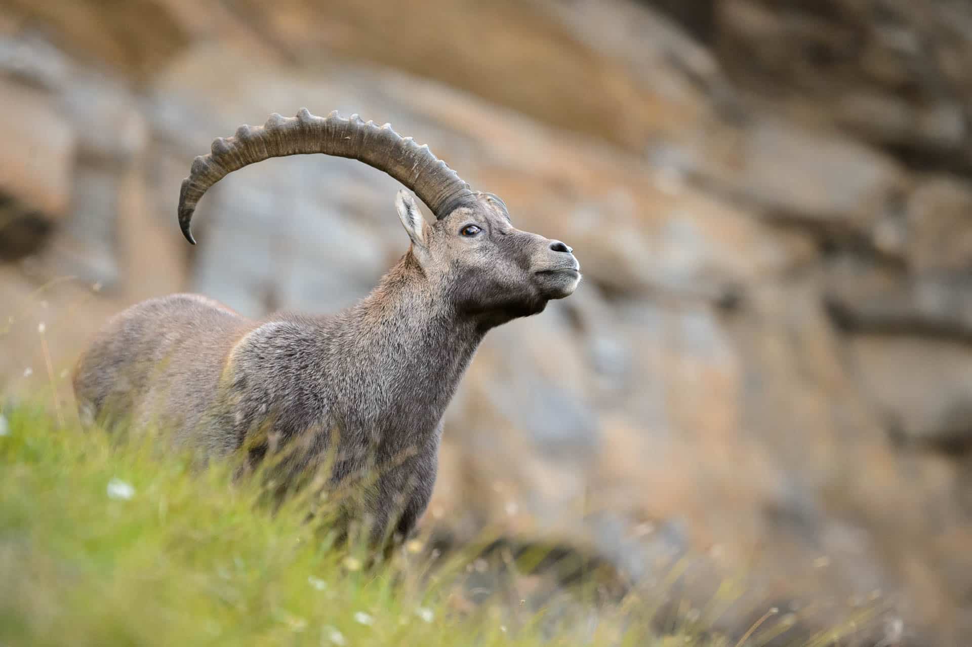 Ein Alpensteinbock mit groรŸen Hรถrnern auf einer alpinen Wiese vor Felsen.