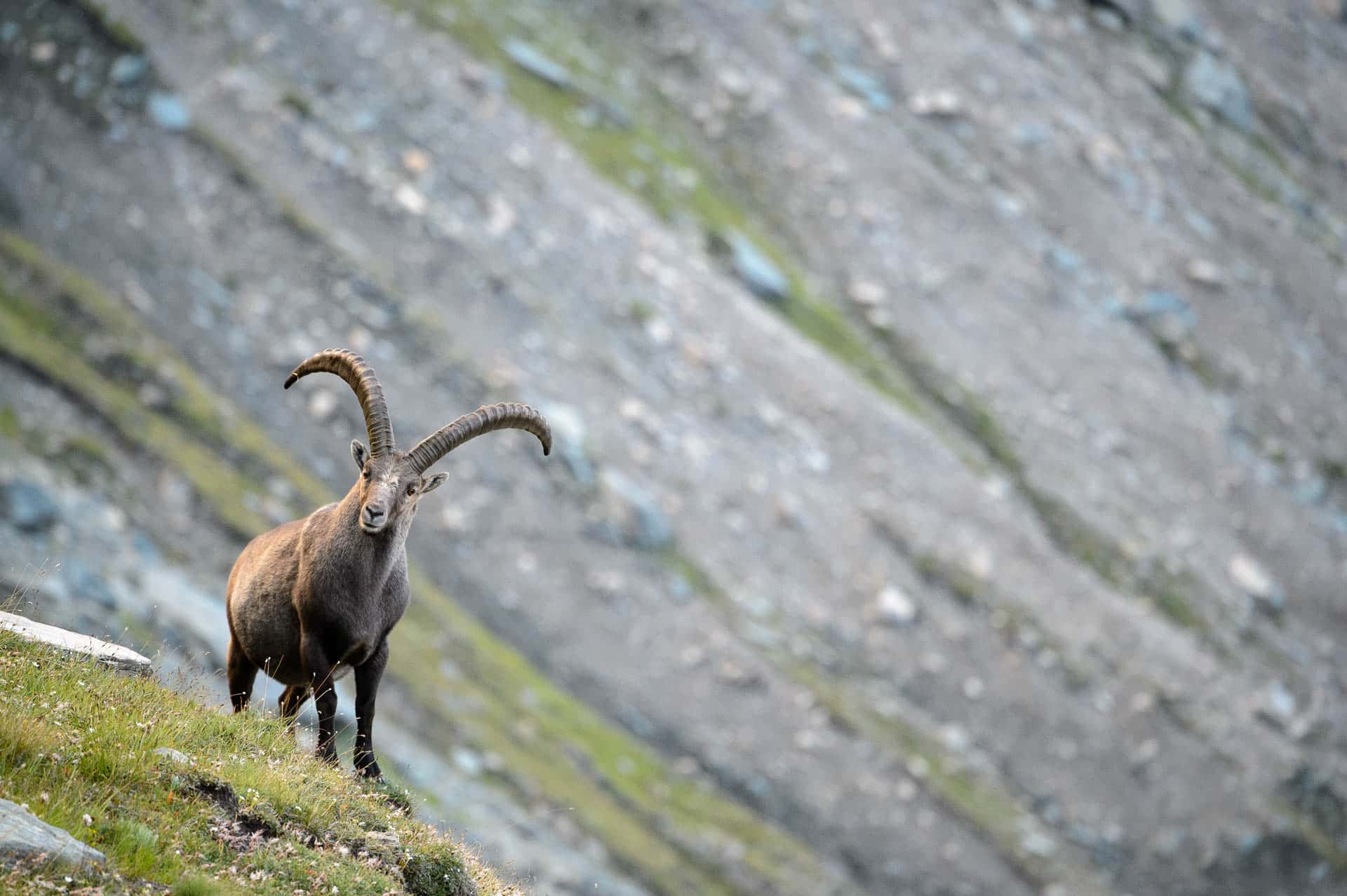 Ein Alpensteinbock mit groรŸen gebogenen Hรถrnern steht auf einem grasbewachsenen Hang.