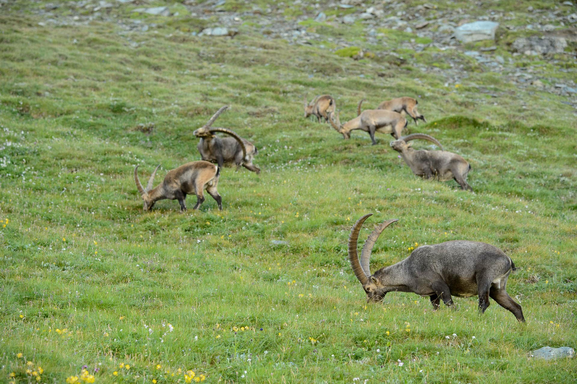 Alpensteinbock mit groรŸen Hรถrnern auf einer blรผhenden Bergwiese.