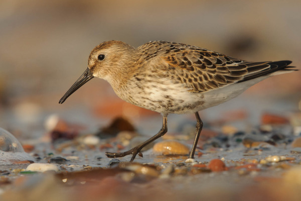 Ein Alpenstrandläufer steht auf einem Kieselstrand und blickt nach rechts.
