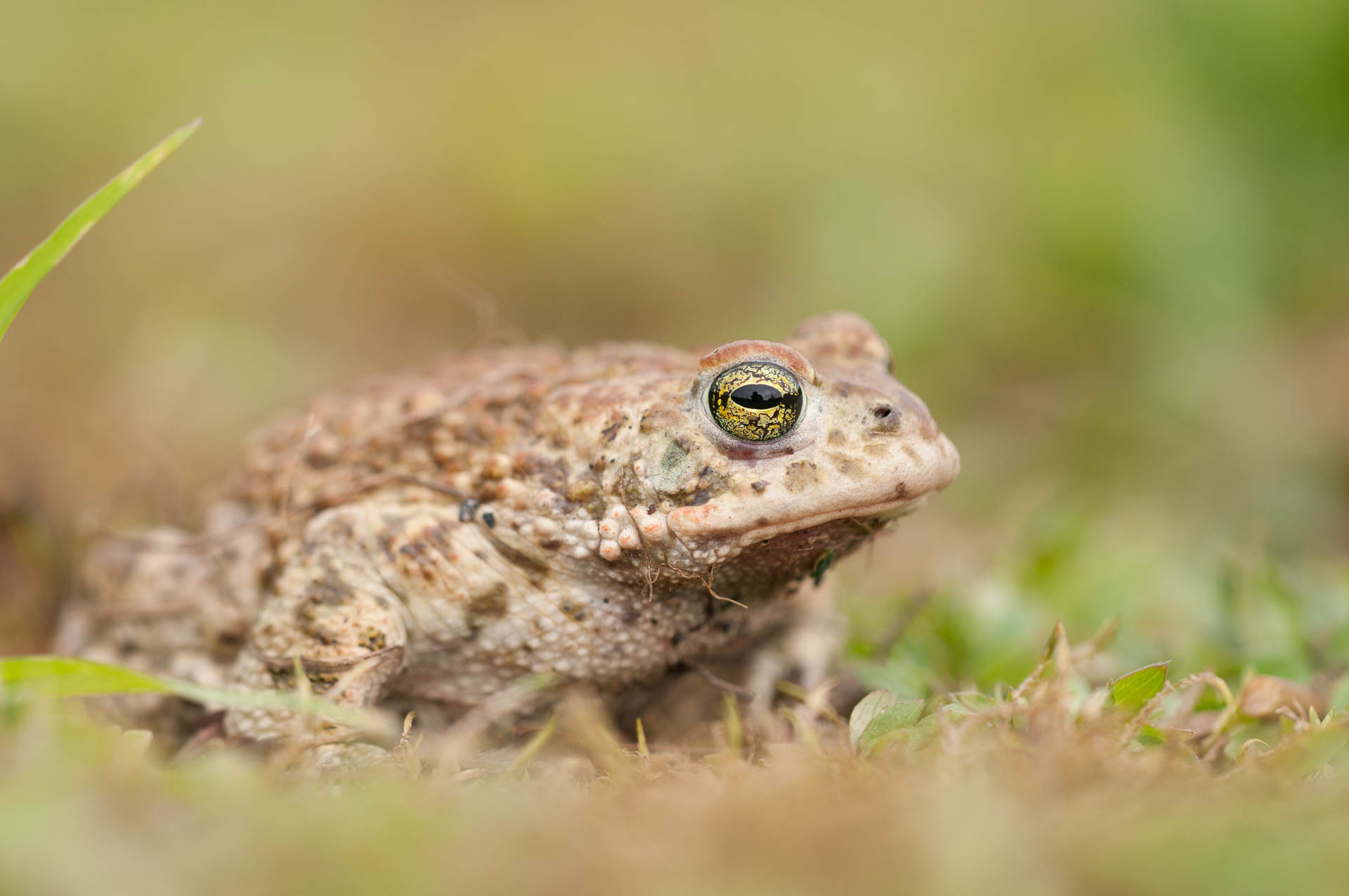 Kreuzkröte ruht auf sandiger Fläche zwischen Grasbüscheln.