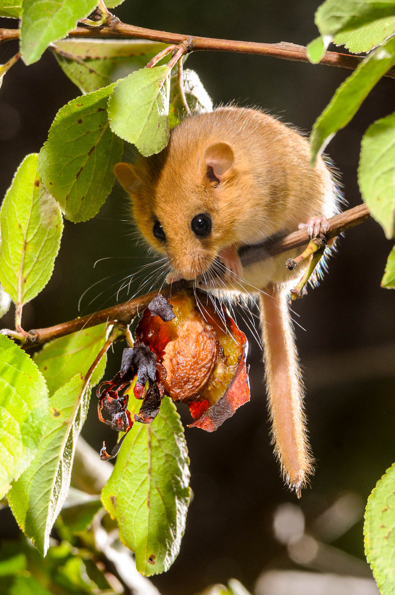 Haselmaus frisst herbstliche Frucht auf Zweig sitzend.
