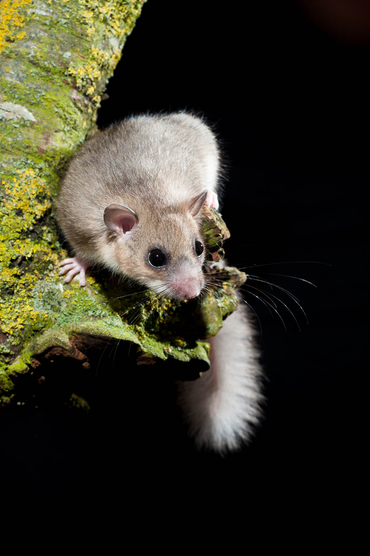 Ein Siebenschläfer (Glis glis) springt von einem Ast im nächtlichen Lebensraum.