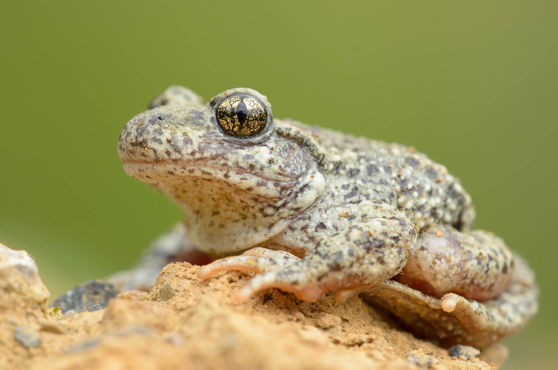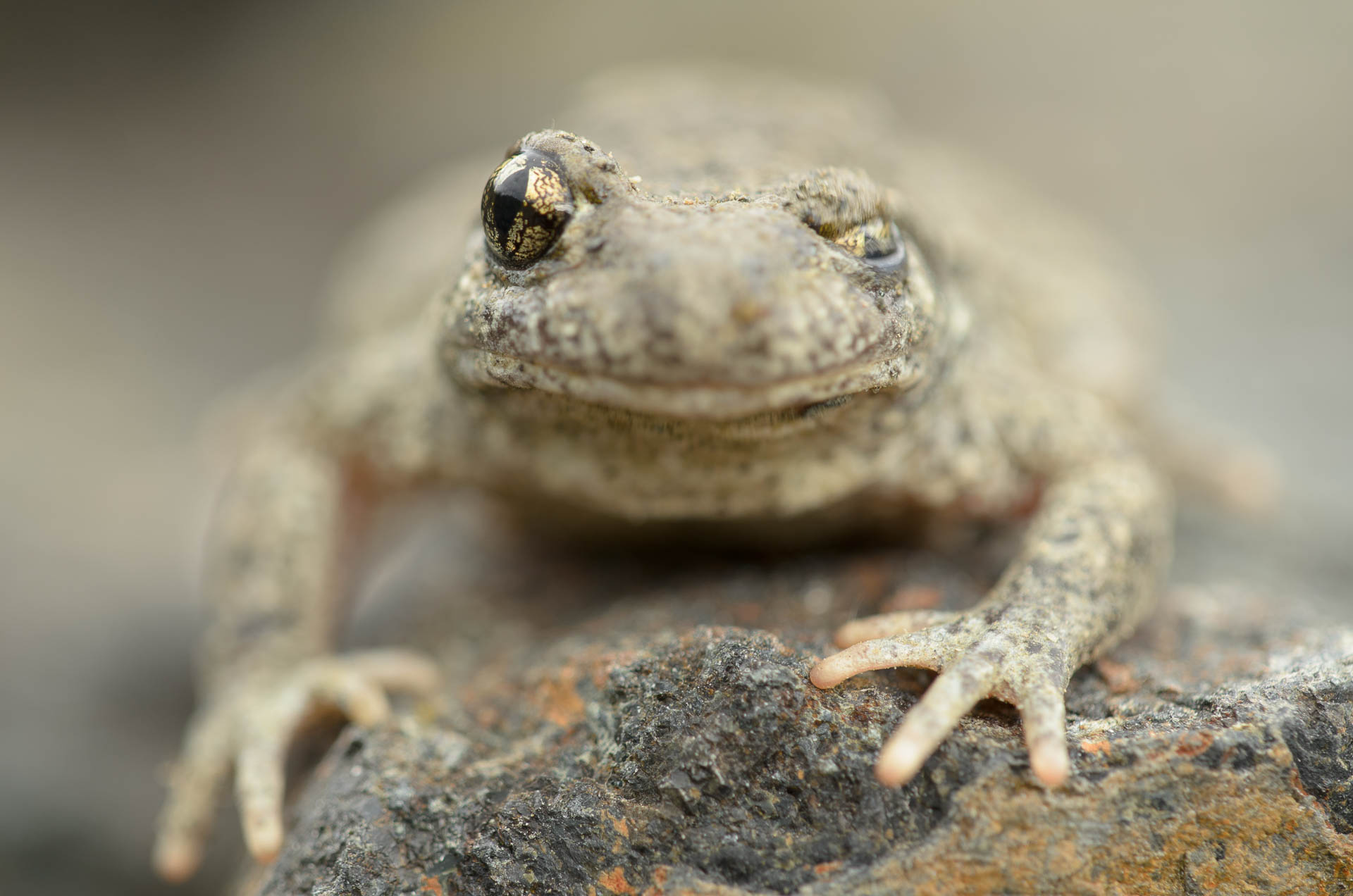 Eine Geburtshelferkröte auf einem Felsen mit detailreichem Blick auf den Körper.