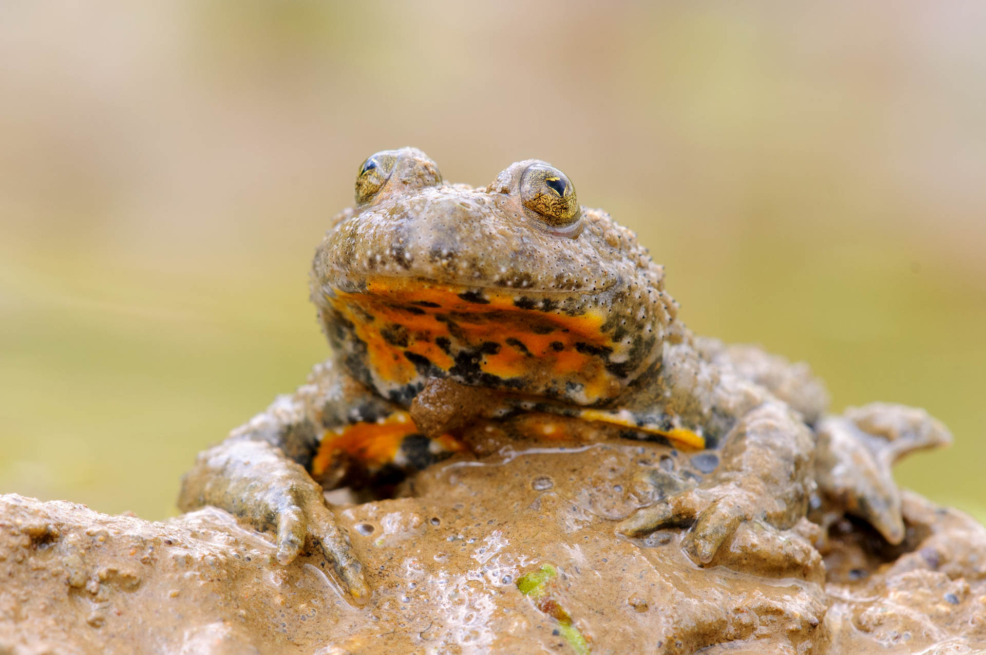 Nahaufnahme einer Gelbbauchunke mit charakteristischer gelber Bauchzeichnung