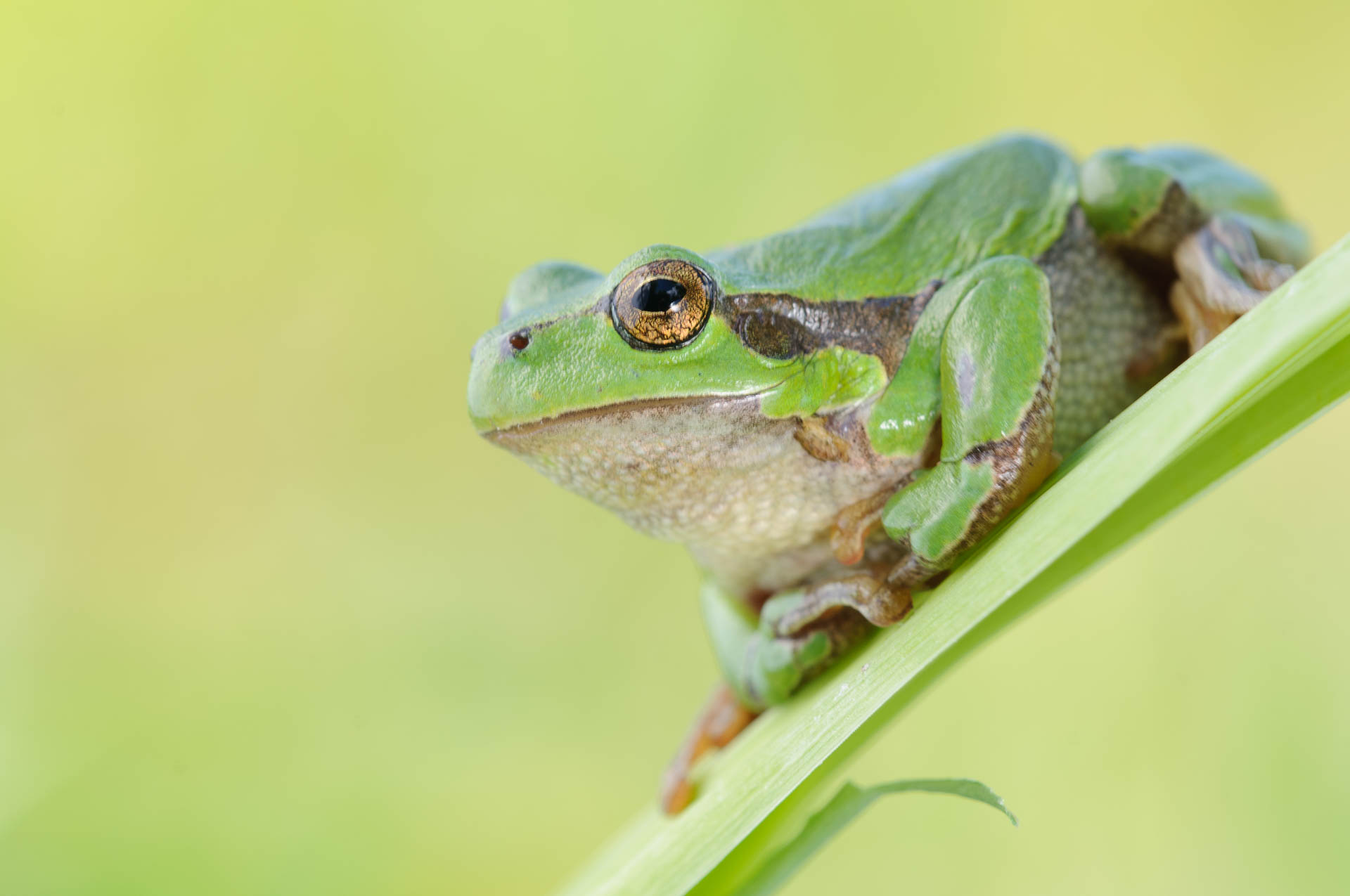 Ein Europäischer Laubfrosch auf einem grünen Schilfblatt im natürlichen Lebensraum.