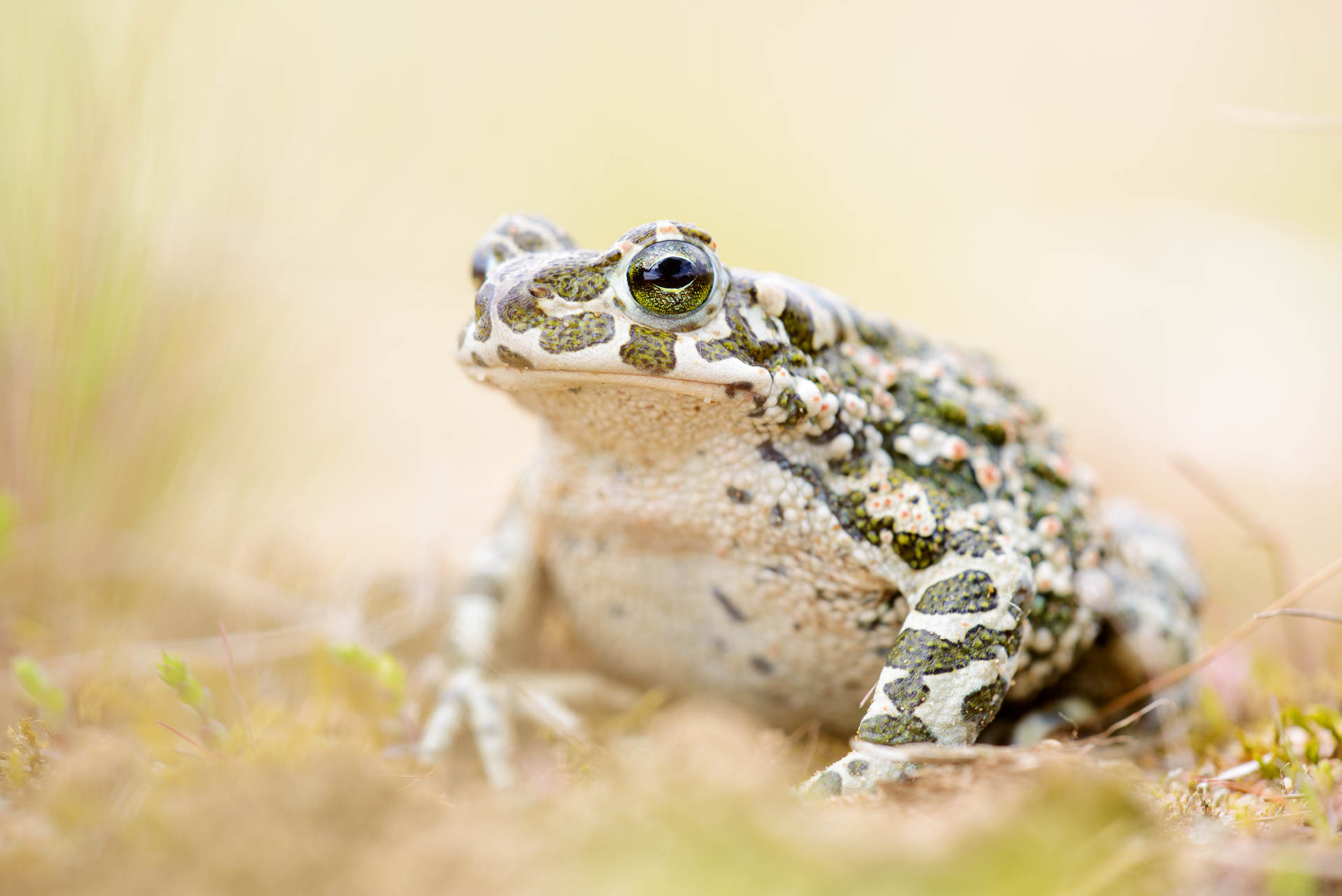 Wechselkröte mit grünlichem Tarnmuster auf sandigem Boden in Nahaufnahme.