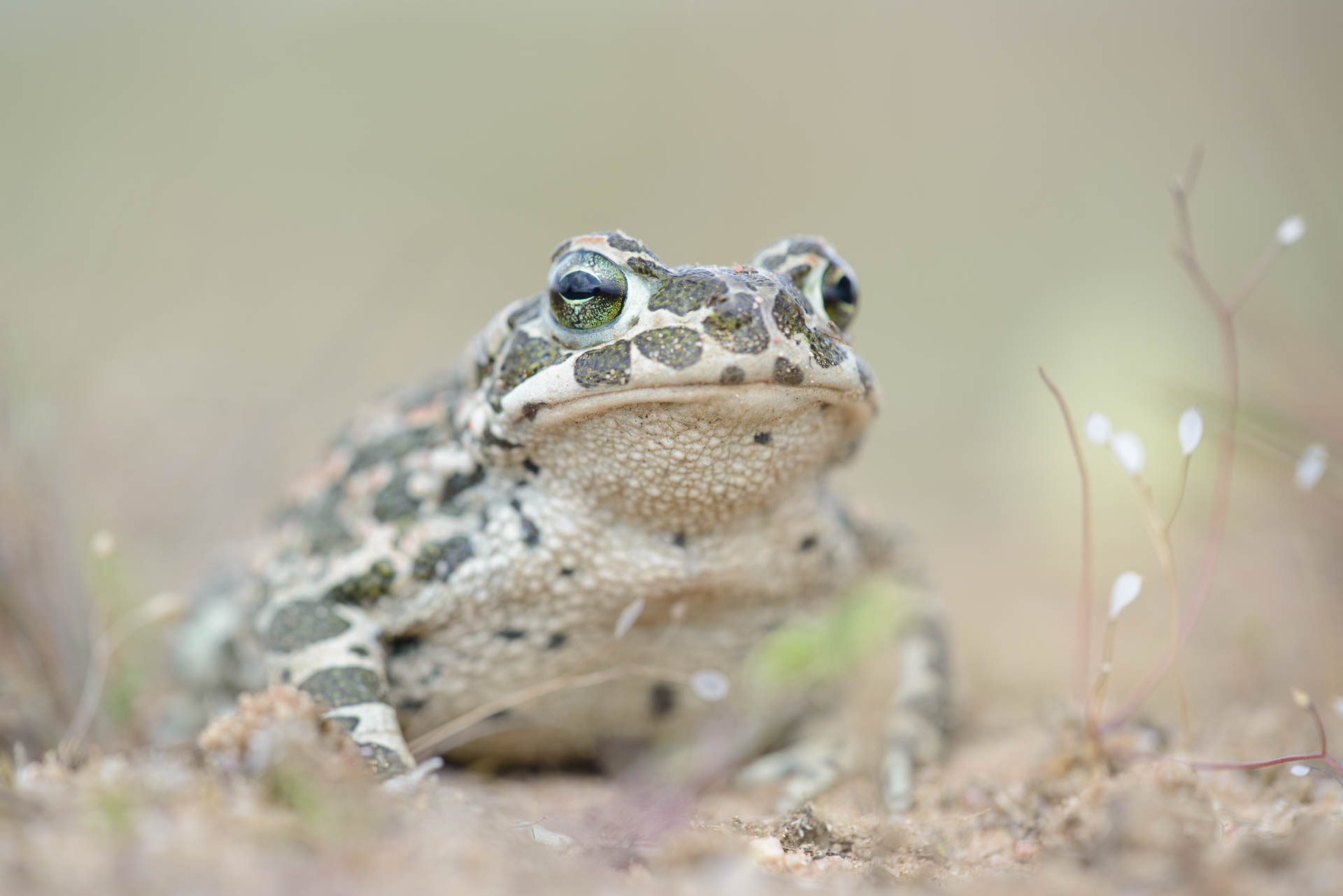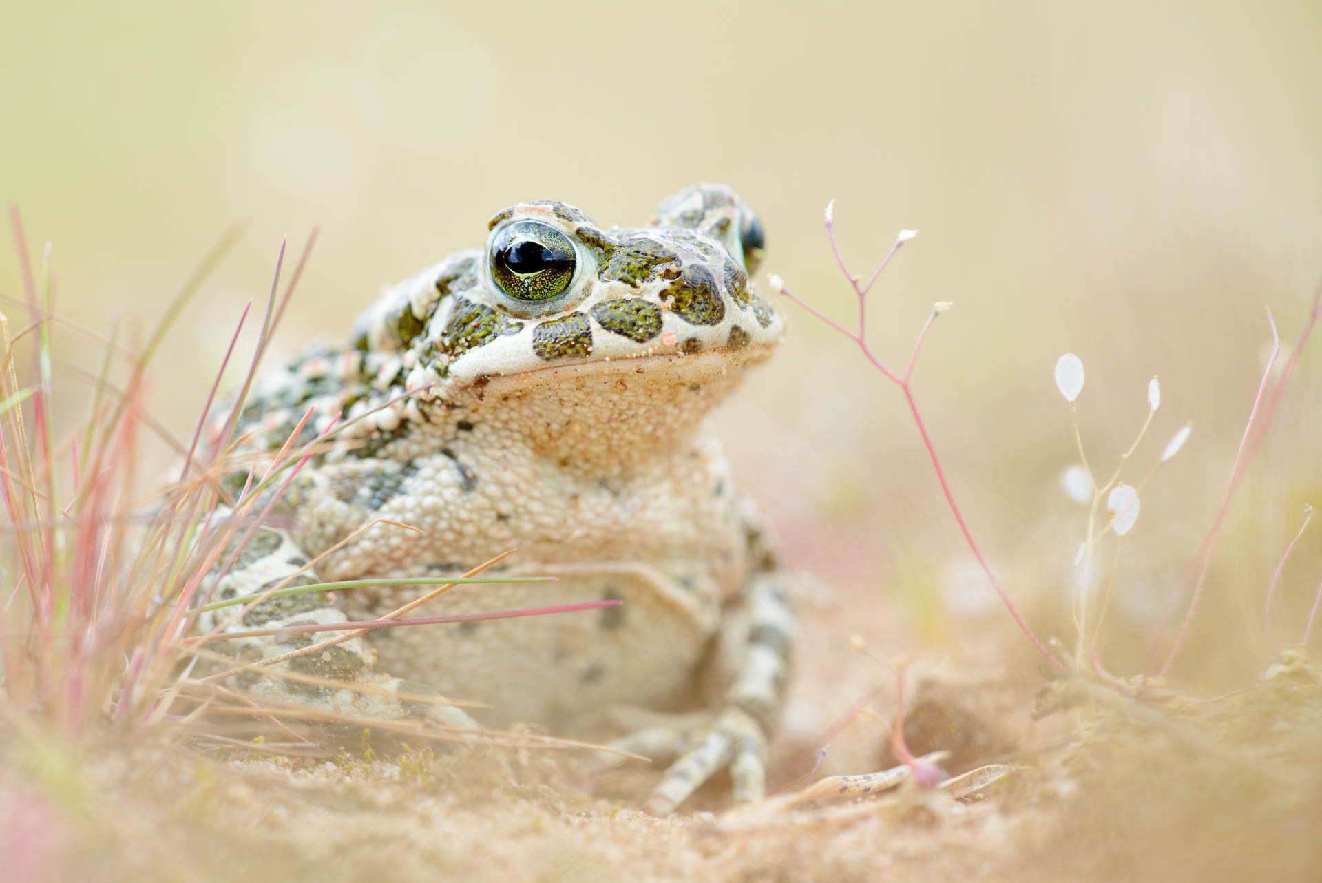 Eine Wechselkröte auf sandigem Boden mit spärlicher Vegetation.