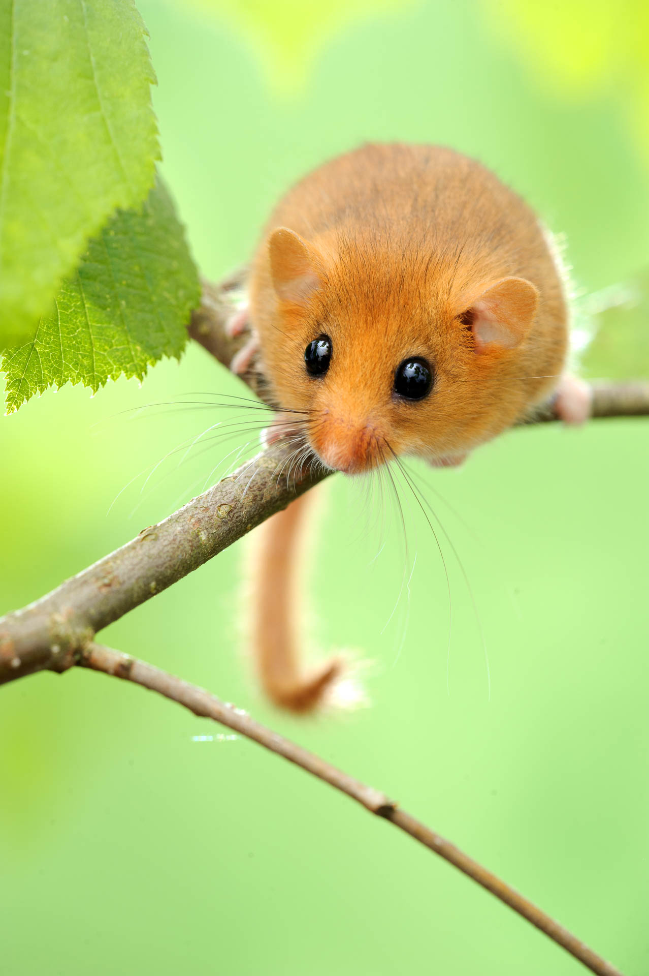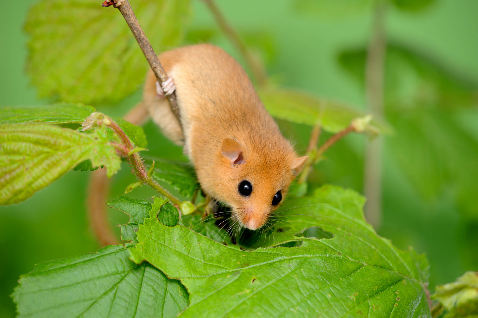Haselmaus klettert an einem grünen Haselnusszweig.