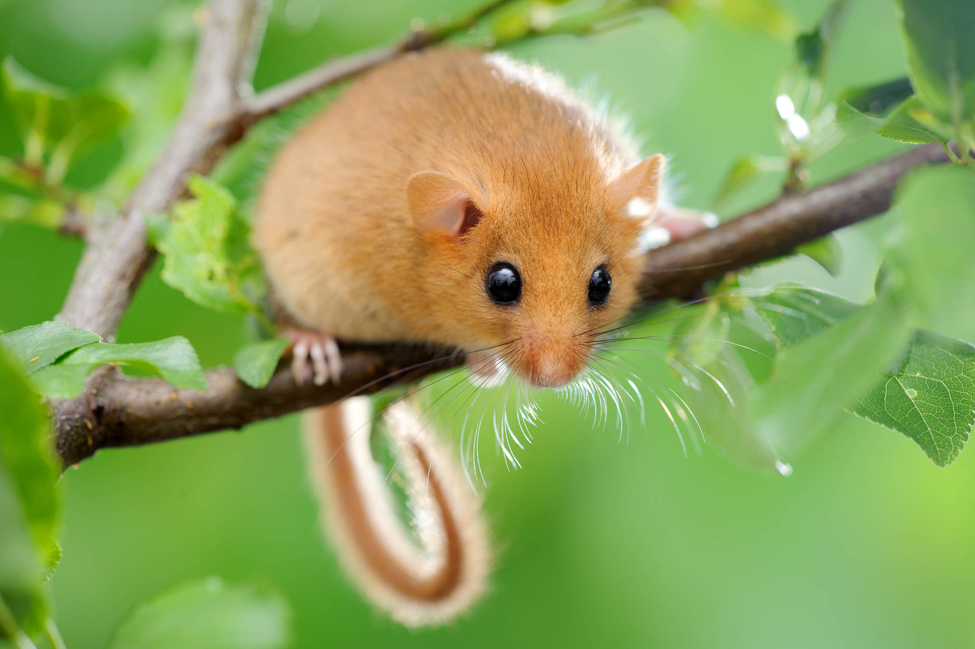 Kleine Haselmaus mit rötlichem Fell sitzt auf einem Ast zwischen grünen Blättern.