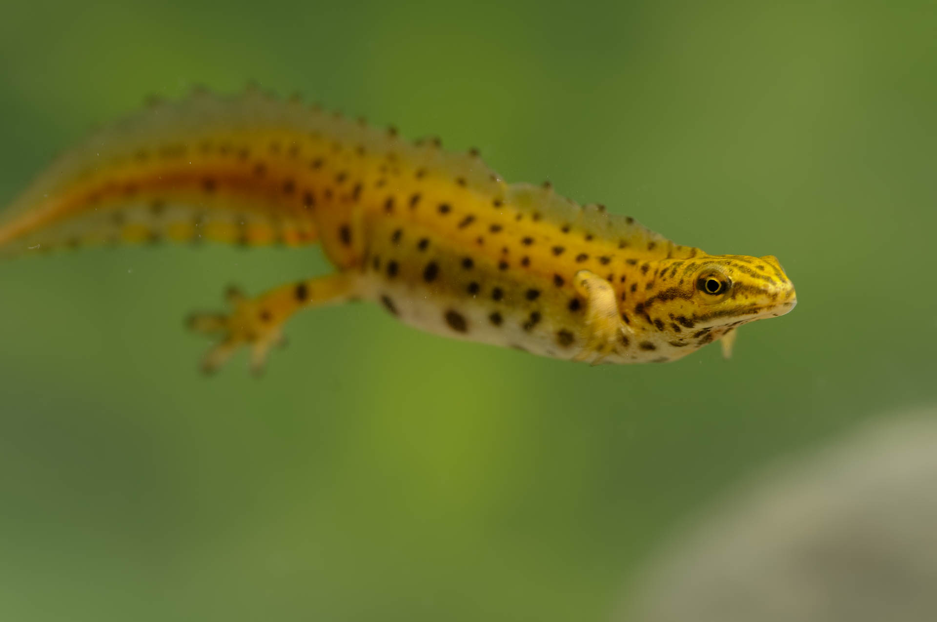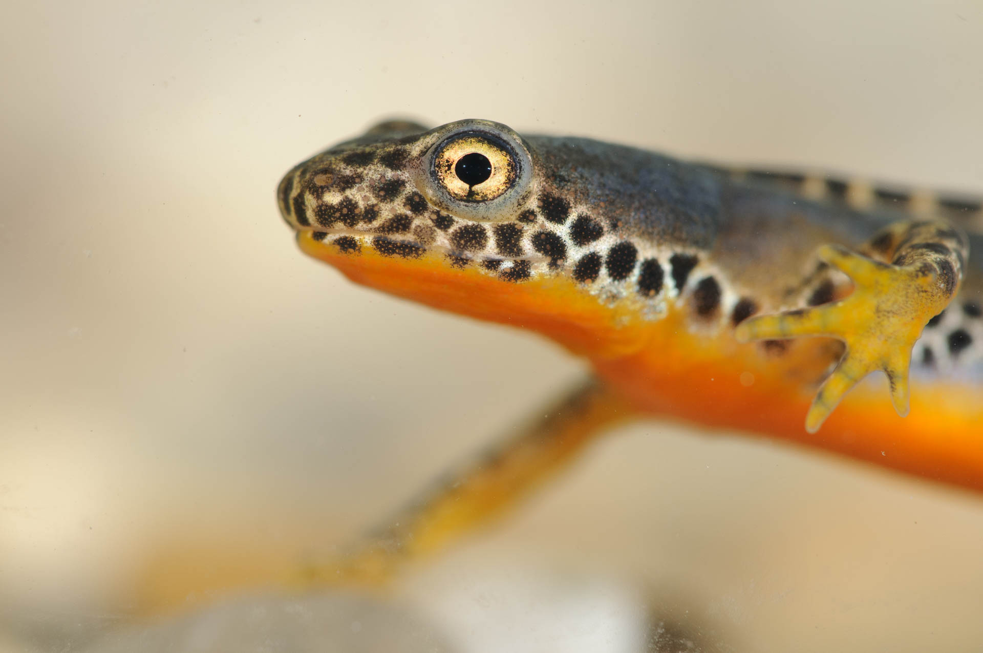 Bergmolch mit auffälliger Musterung und orangefarbenem Bauch.