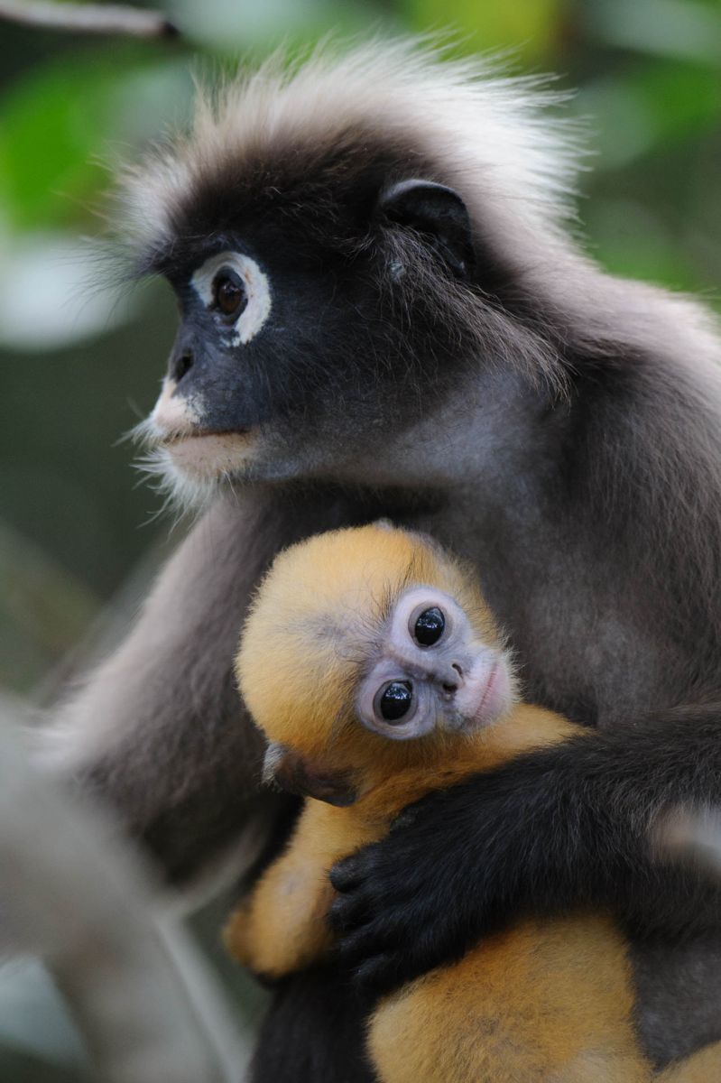 Brillenlanguren-Mutter mit hellem Jungtier im Arm, Thailand.