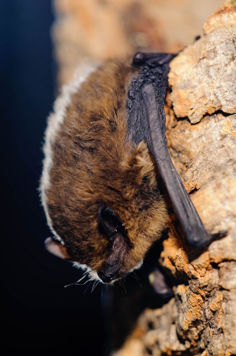 Zwergfledermaus ruht an einem Baumstamm, dicht an der Rinde.