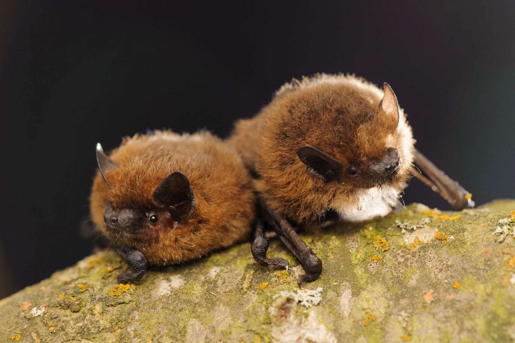 Zwei Zwergfledermäuse ruhen auf einer Baumrinde in Nahaufnahme.