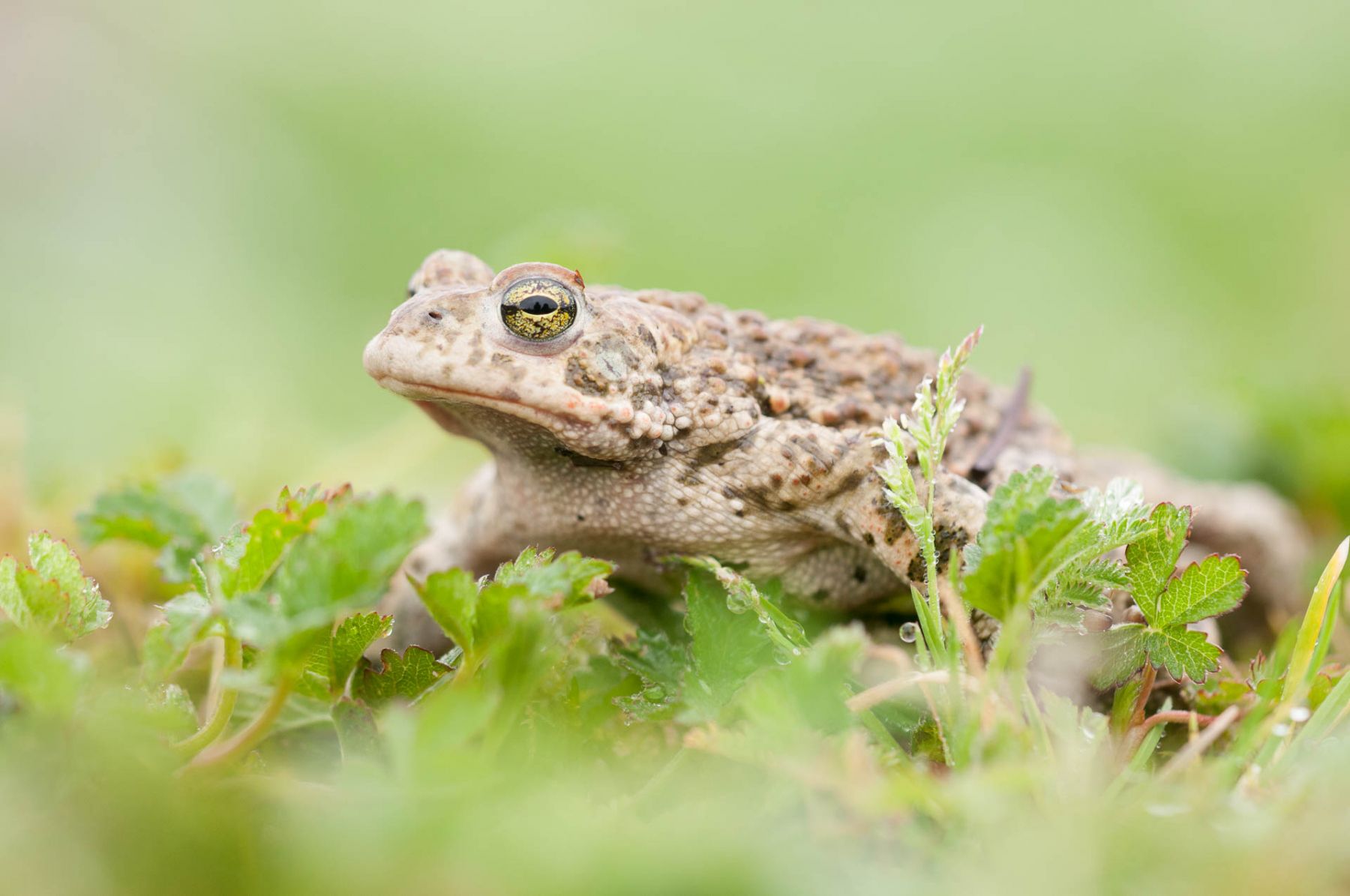 Eine Kreuzkröte im Gras mit charakteristischer Fleckung und grünlichen Augen.