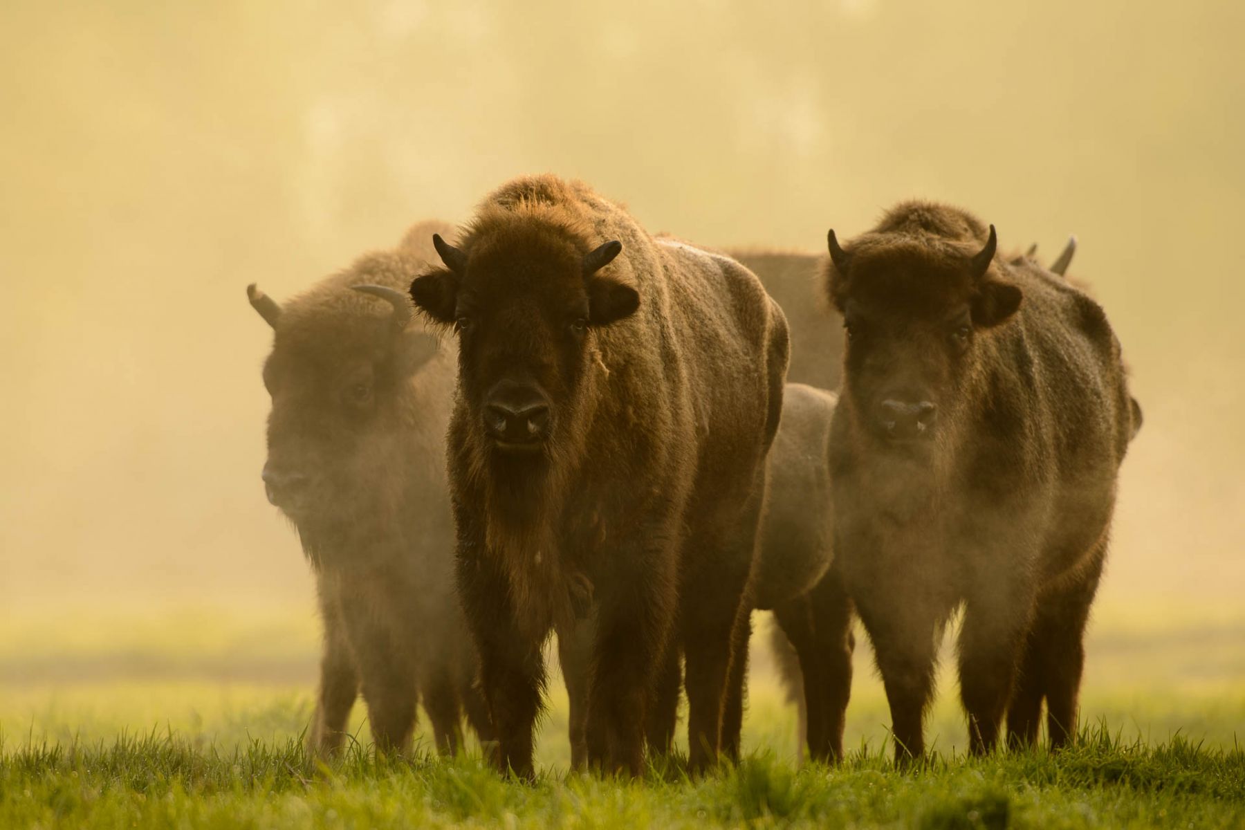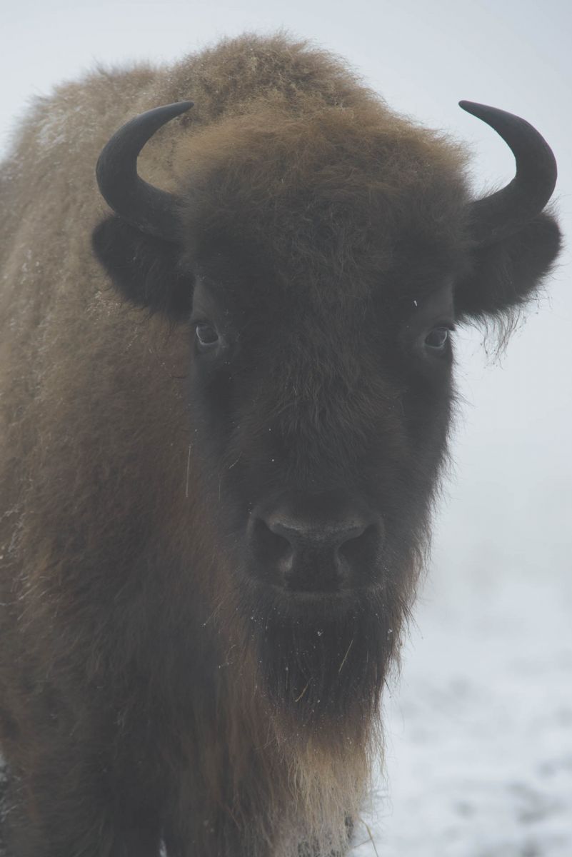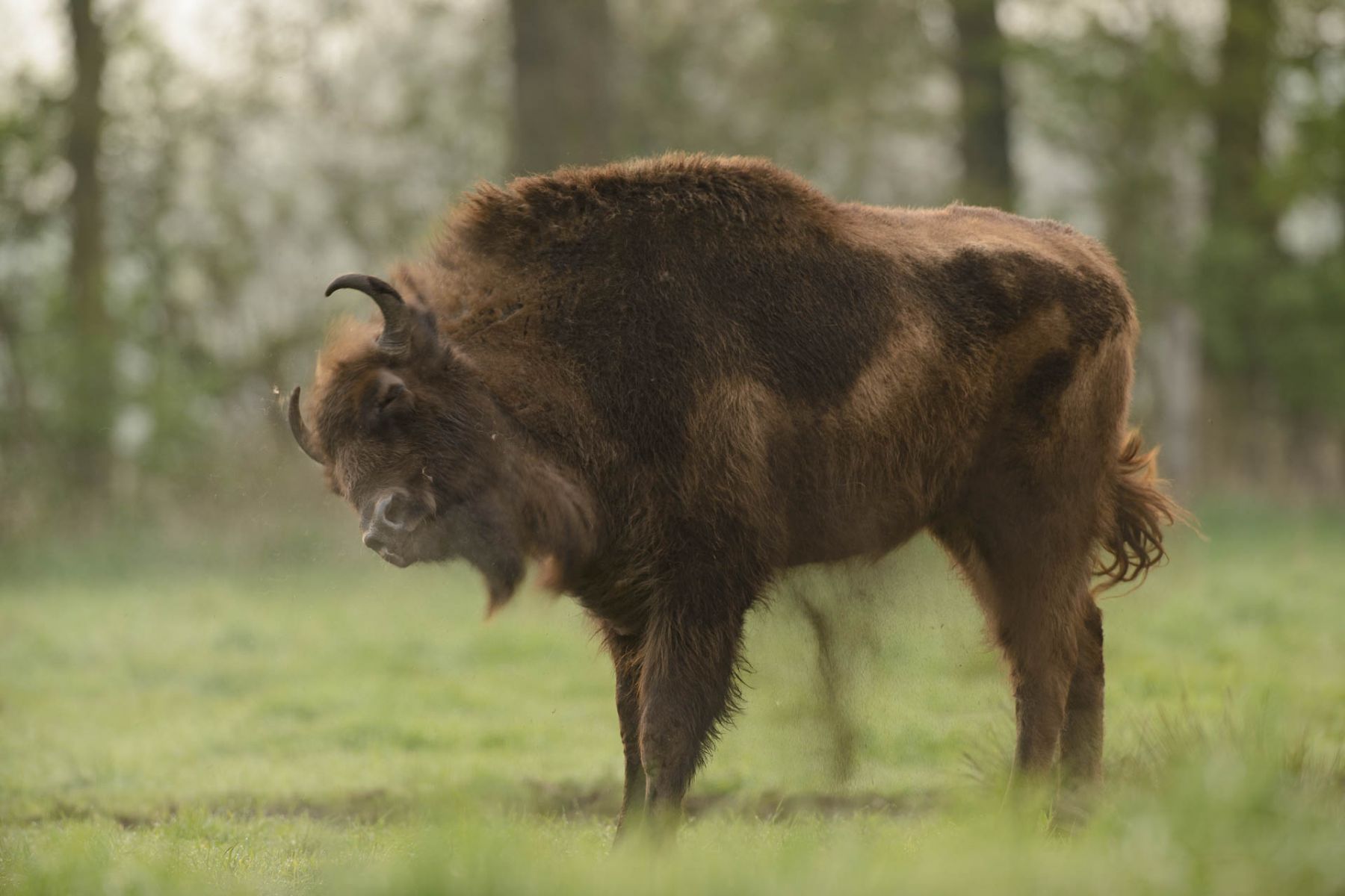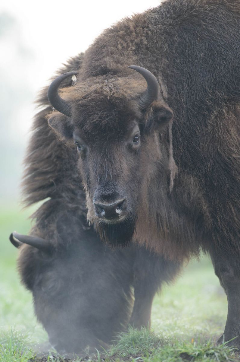Ein Wisent im Nebel des Donaumoos, im Frühling aufgenommen.