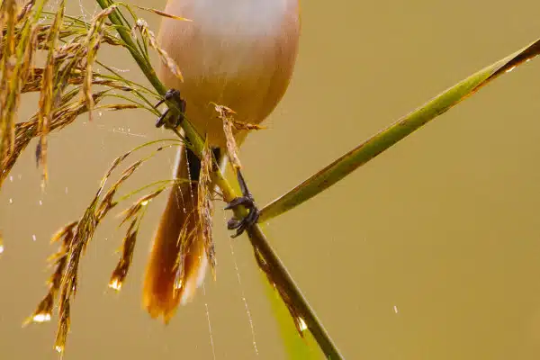 Bartmeise sitzt im Schilf, teilweise verdeckt, mit gelbbraunem Hintergrund.