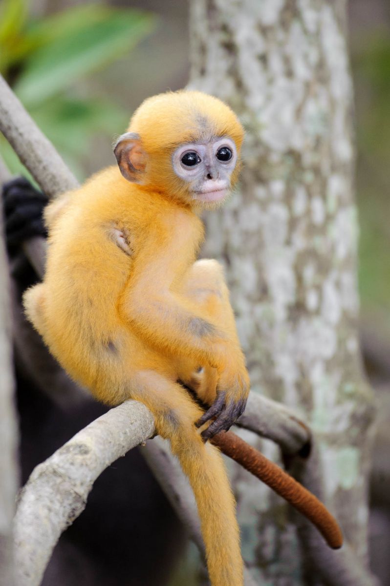Ein junger orangefarbener Brillenlangur sitzt auf einem Ast im Baum.