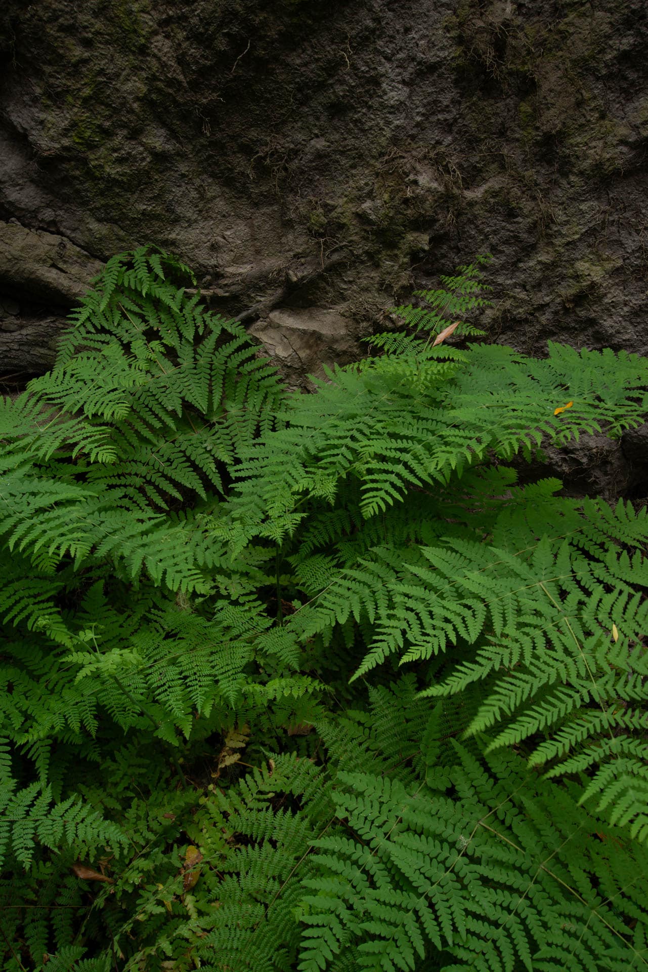 Dichte Farnansammlung auf Felsen im tropischen Regenwald.