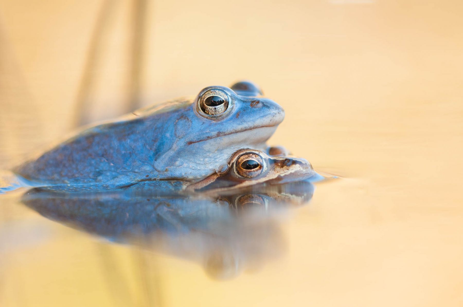 Blau gefärbtes Moorfrosch-Männchen umklammert braunes Weibchen im Wasser.