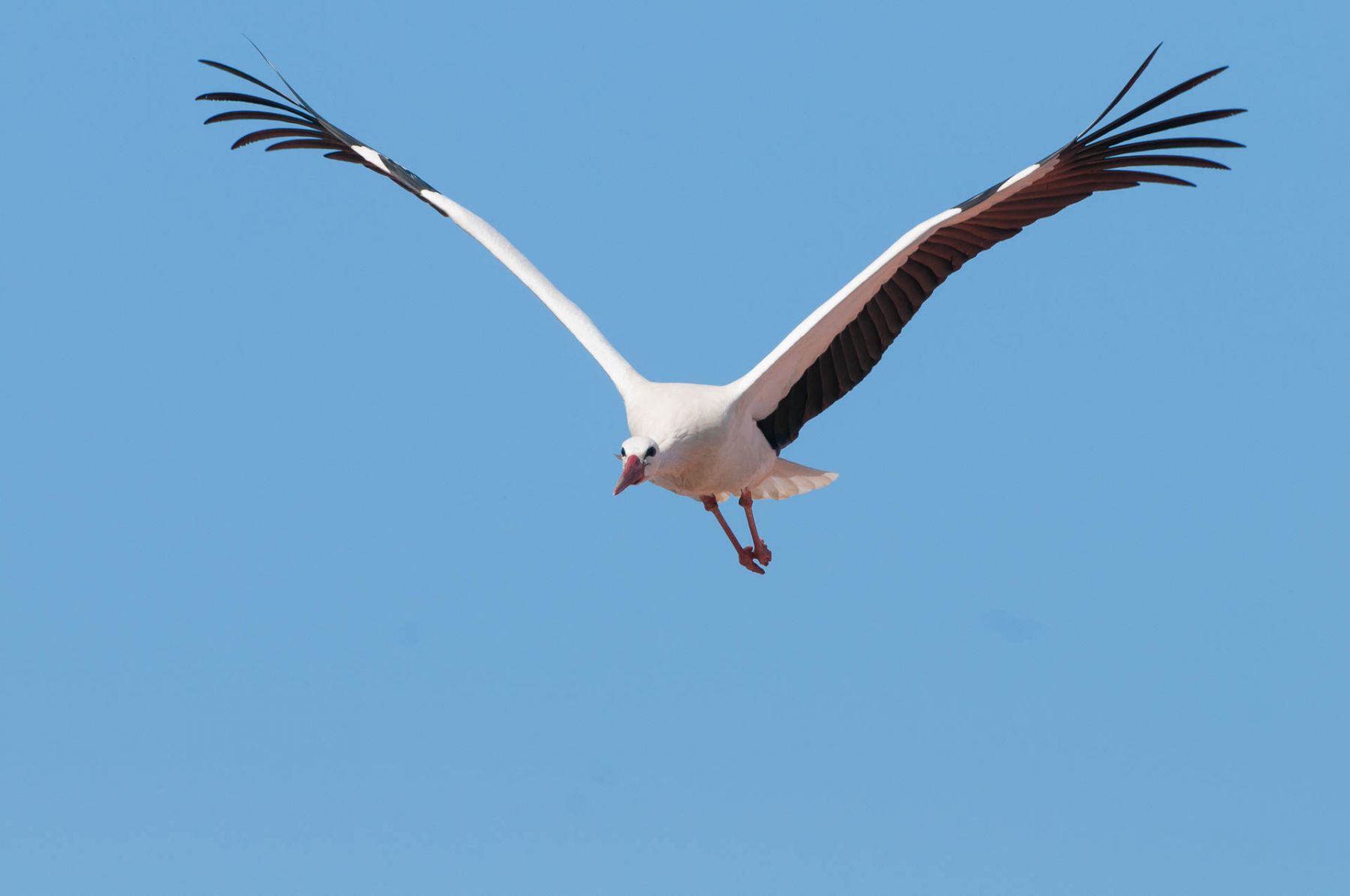 Ein Weißstorch fliegt mit ausgebreiteten Flügeln am blauen Himmel.