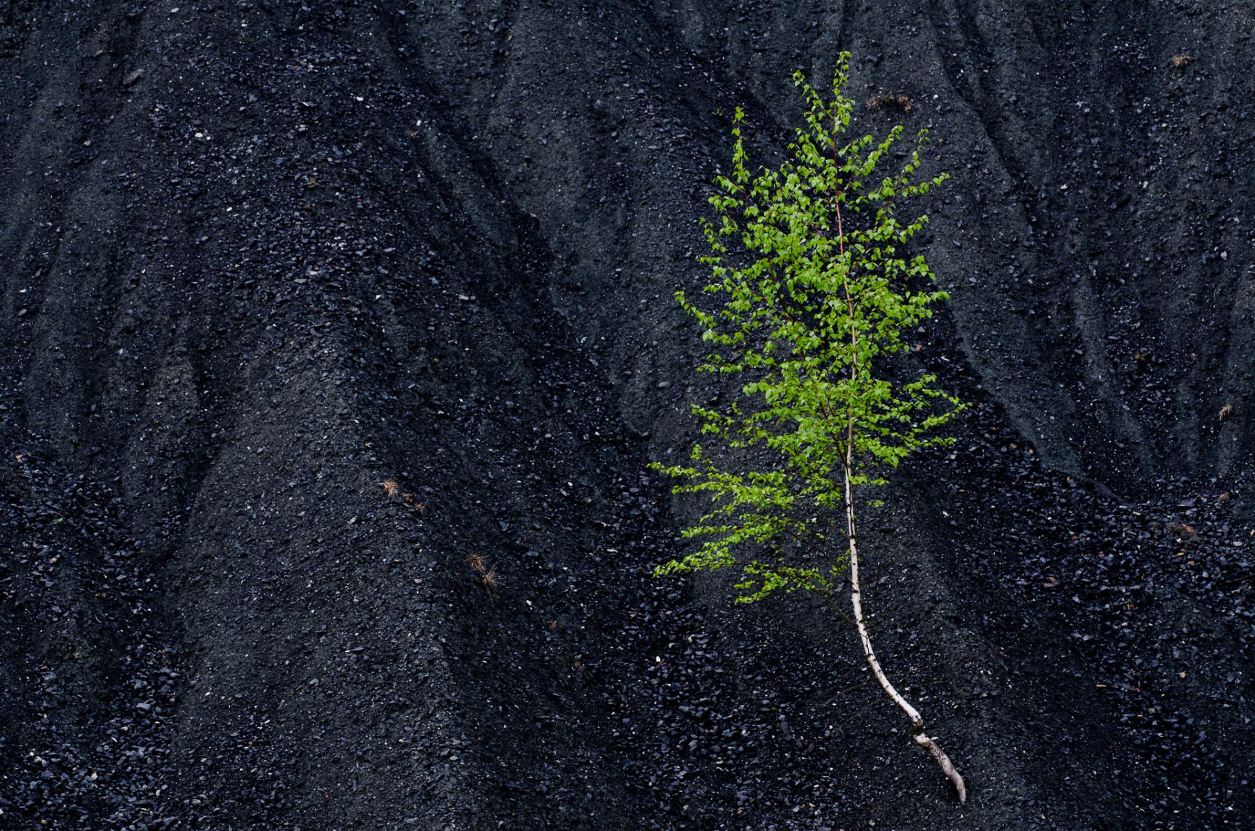 Eine grüne Birke wächst auf einer dunklen Oberfläche aus Gestein.