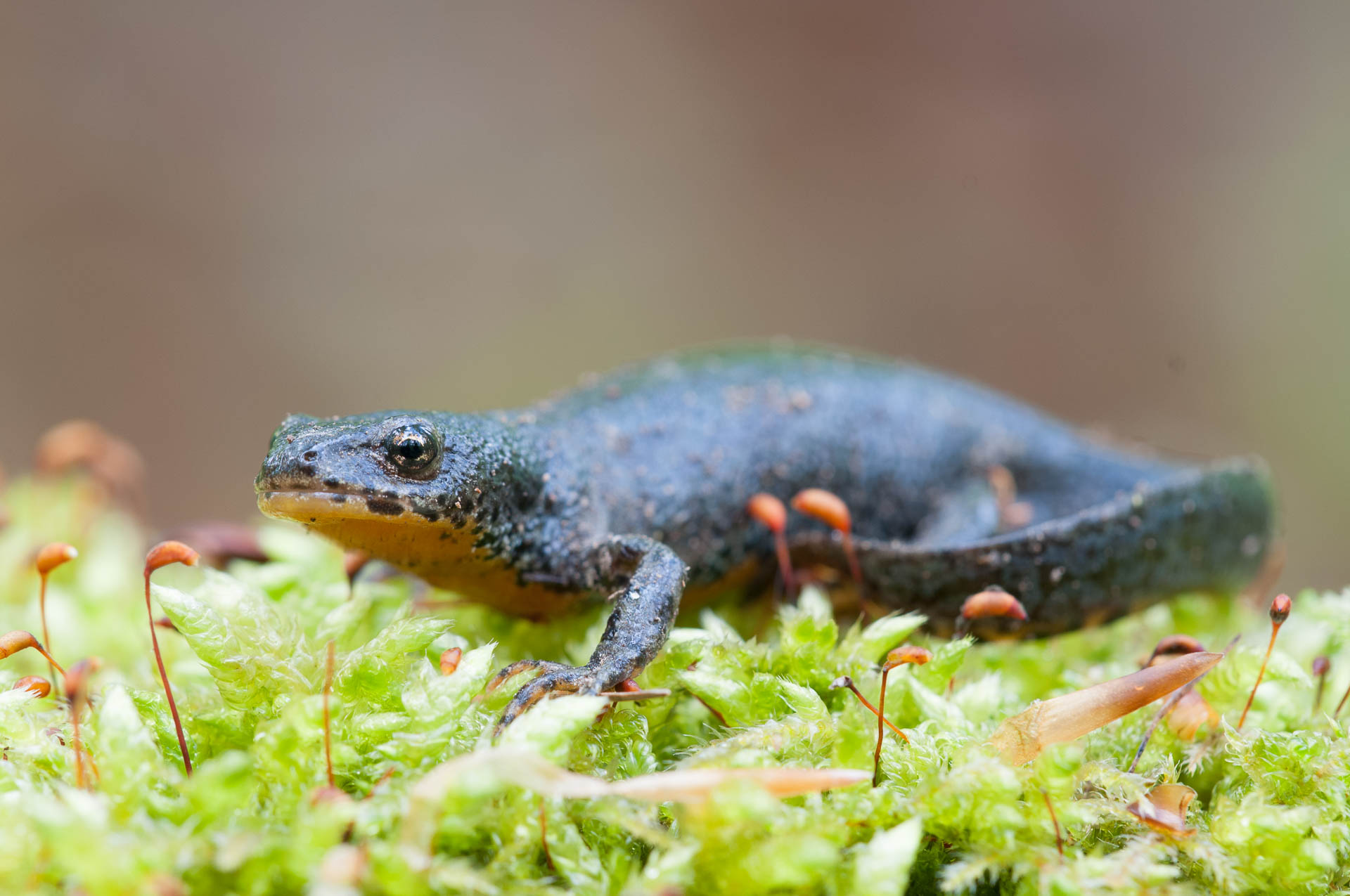 Bergmolch liegt auf moosbedecktem Untergrund, sucht nach Nahrung.