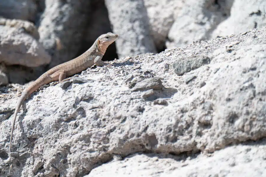 Kanaren-Rieseneidechse auf felsigem Untergrund, seitlich liegend.