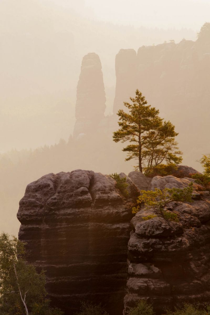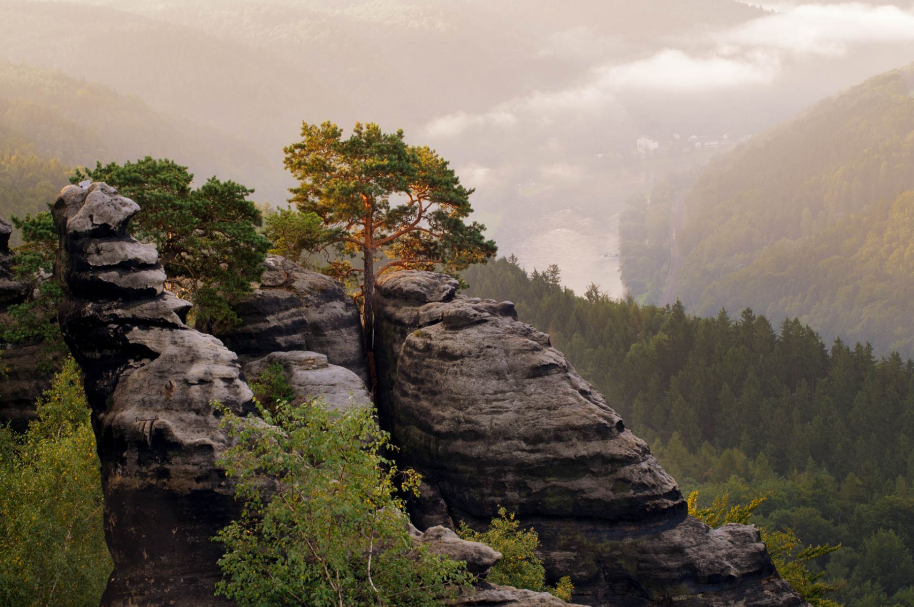 Felsiger Aussichtspunkt mit Kiefer im Elbsandsteingebirge.