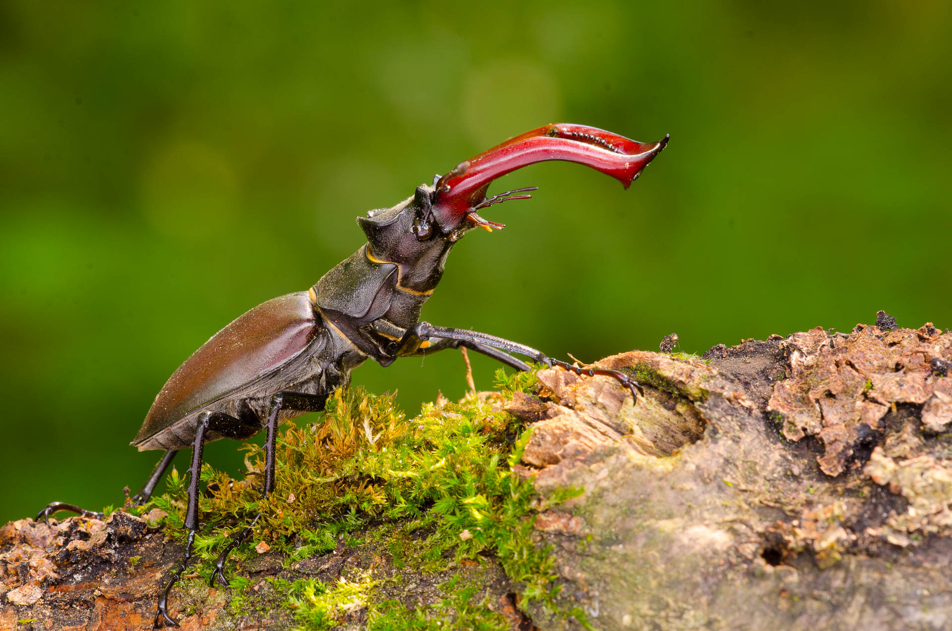 Nahaufnahme eines Hirschkäfers mit großen, rötlichen Mandibeln auf grünem Hintergrund.