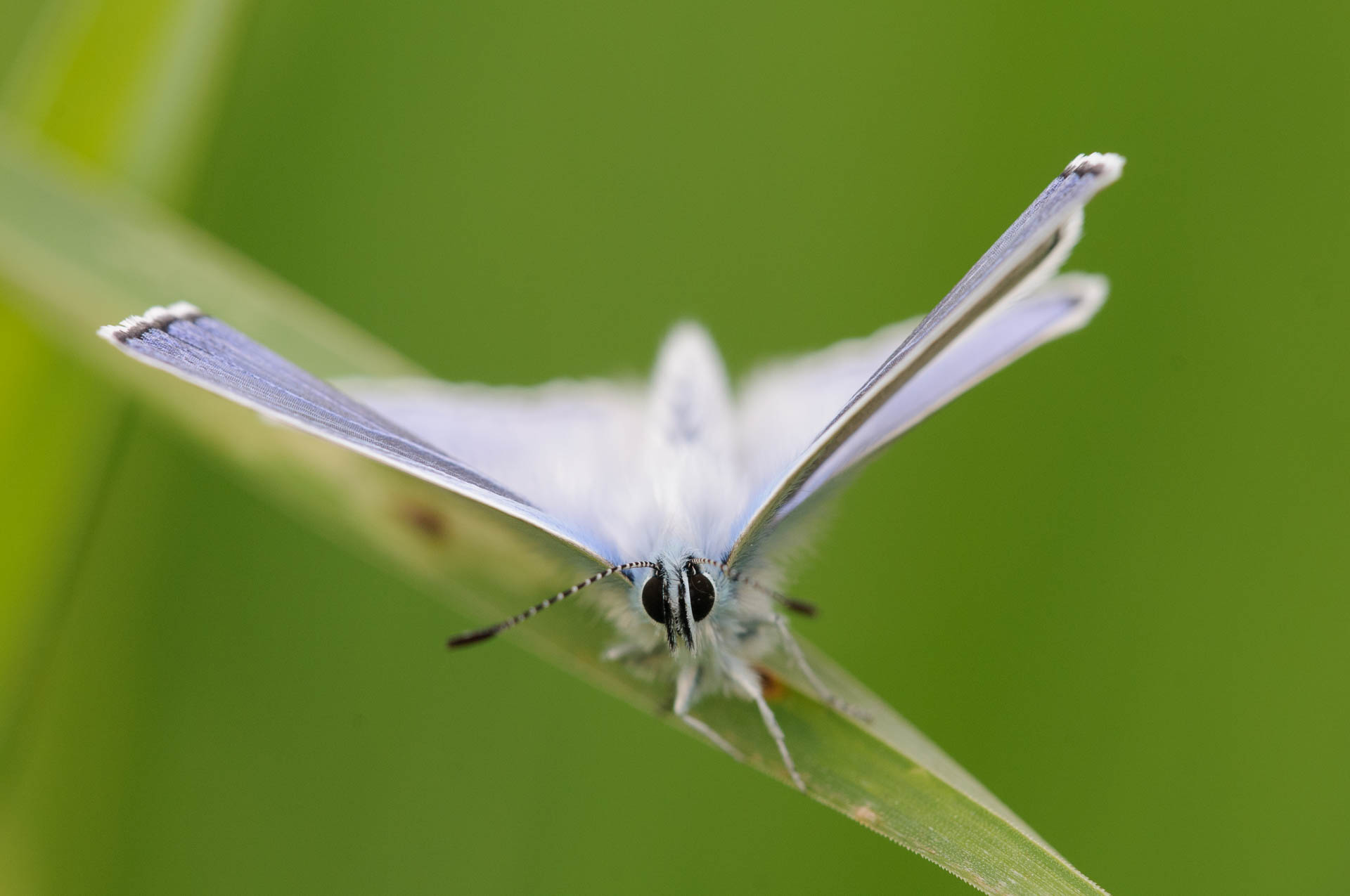 Frontalansicht eines blauen Bläulings auf einem Grasblatt vor grünem Hintergrund.