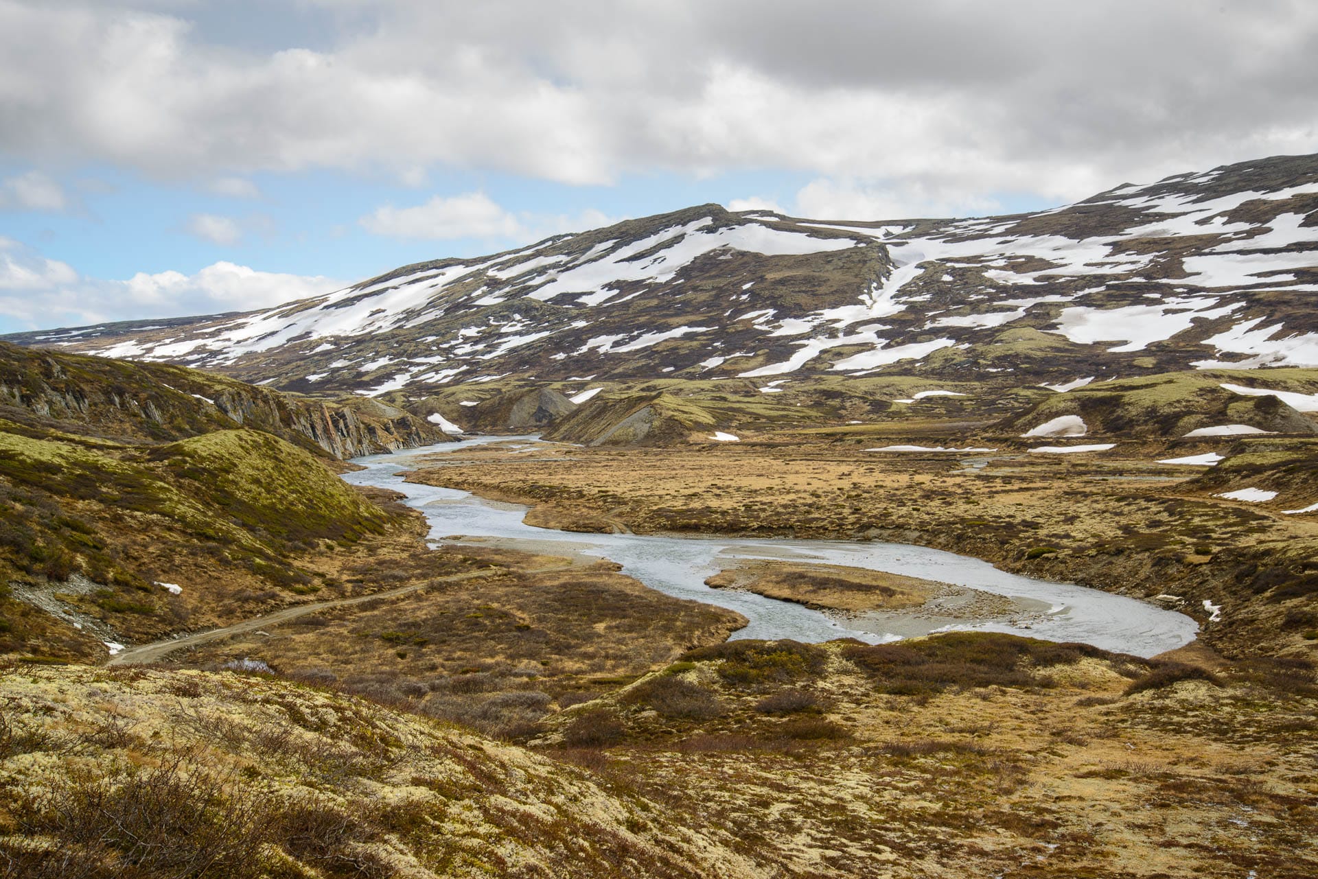 Weite norwegische Landschaft mit Fluss und schneebedeckten Bergen im Dovrefjell.