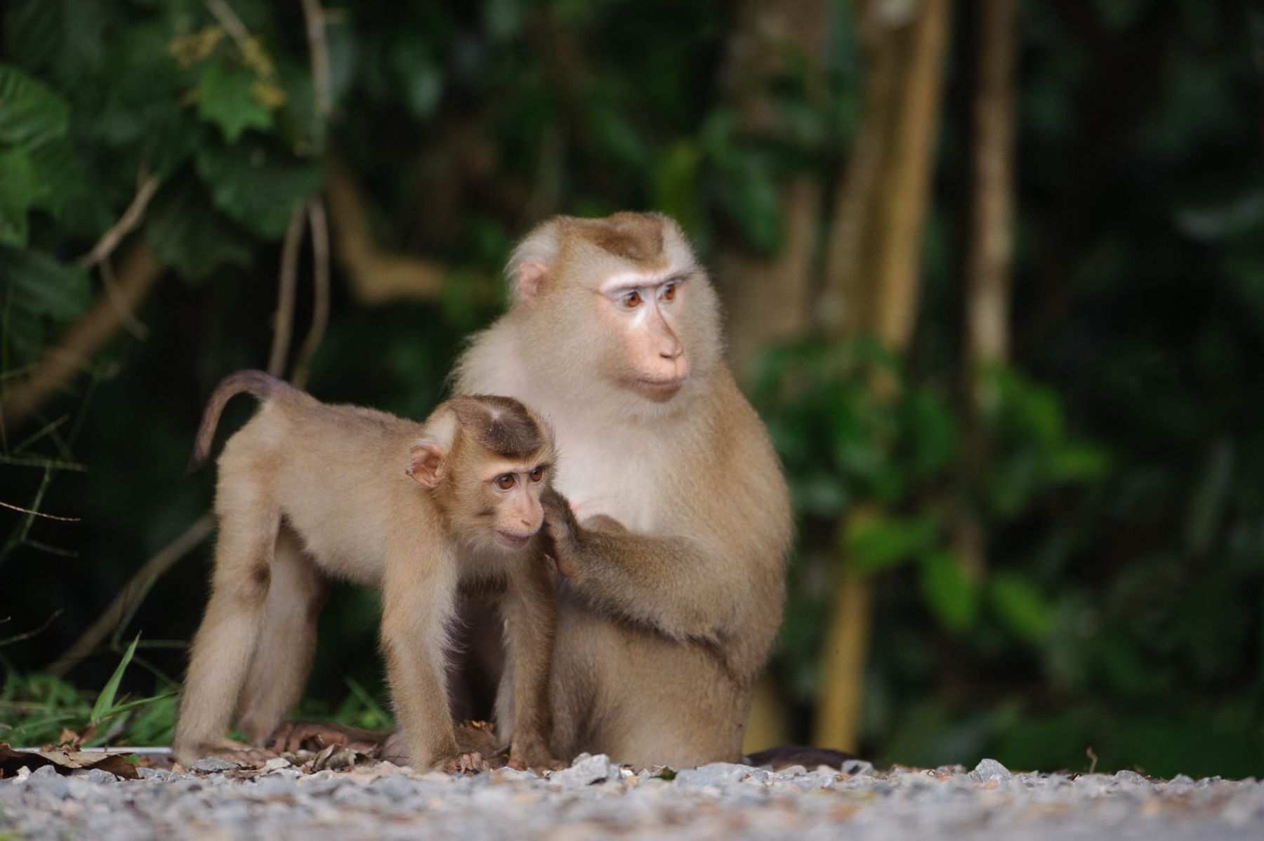 Langschwanz-Makakmutter hält Jungtier auf steinigem Untergrund.