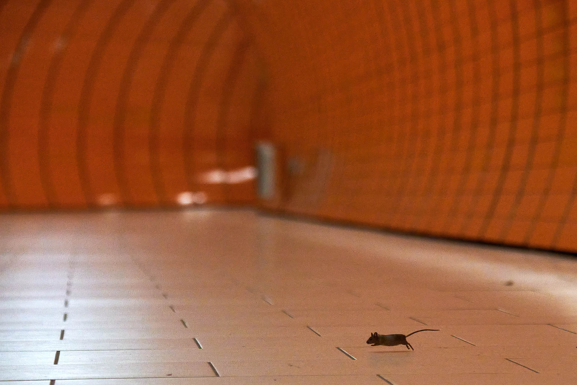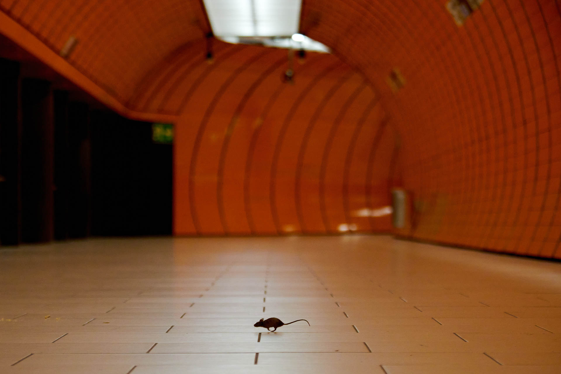 Hausmaus läuft durch einen orangefarbenen U-Bahn-Tunnel.