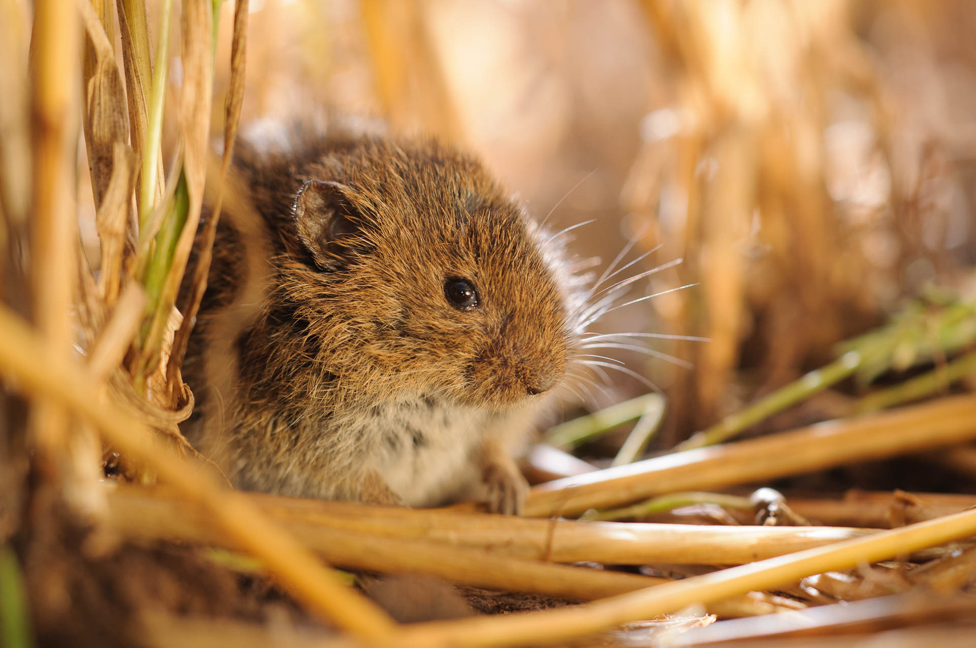 Rötelmaus zwischen trockenen Strohhalmen in einem Feld