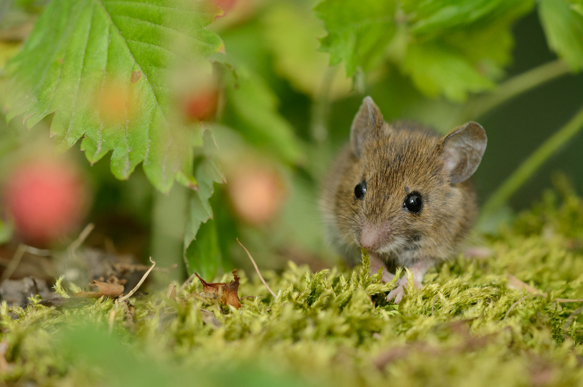 Eine Waldmaus sitzt auf moosigem Boden und blickt vorsichtig umher.