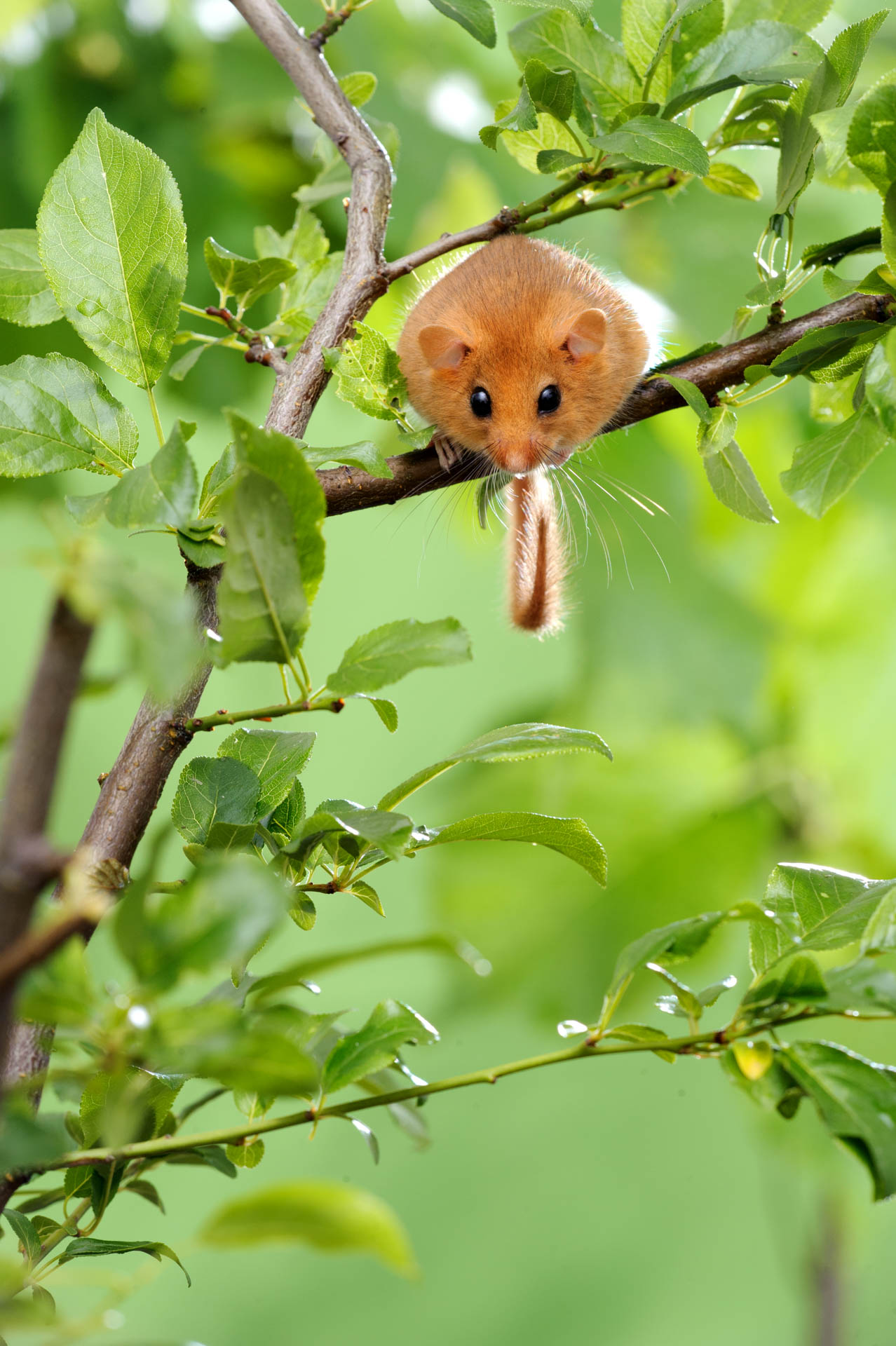 Haselmaus hängt kopfüber in einem grünen Strauch, umgeben von Blättern.
