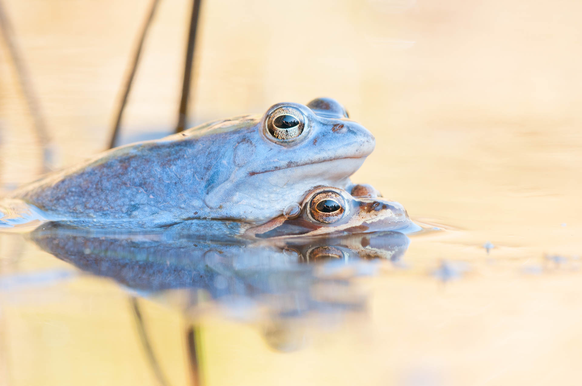 Zwei Moorfrösche in Paarungshaltung im Wasser, das Männchen ist blau gefärbt.