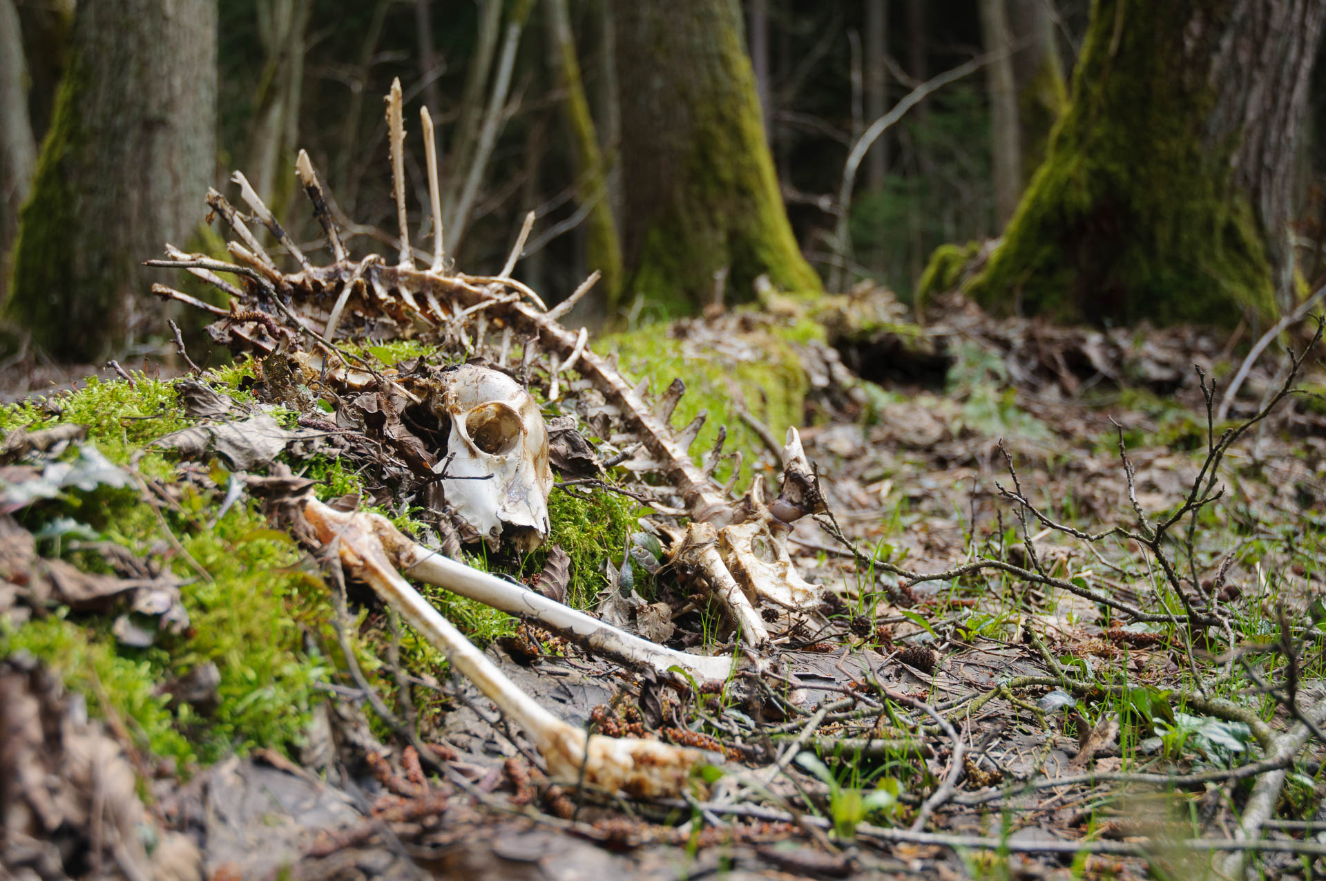 Skelett eines Rehs in einem mossigen Waldgebiet.