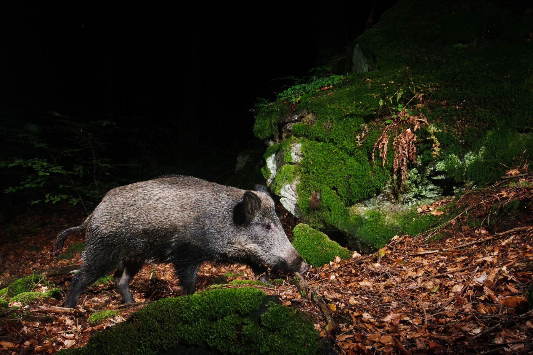 Ein Wildschwein im moosbedeckten Wald in der Nacht.