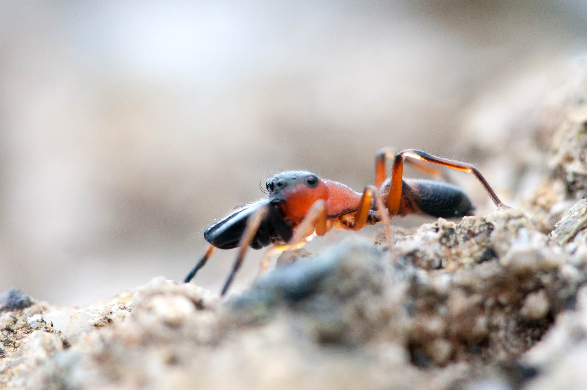 Ameisenspringspinne krabbelt über felsigen Boden und imitiert Ameisen.