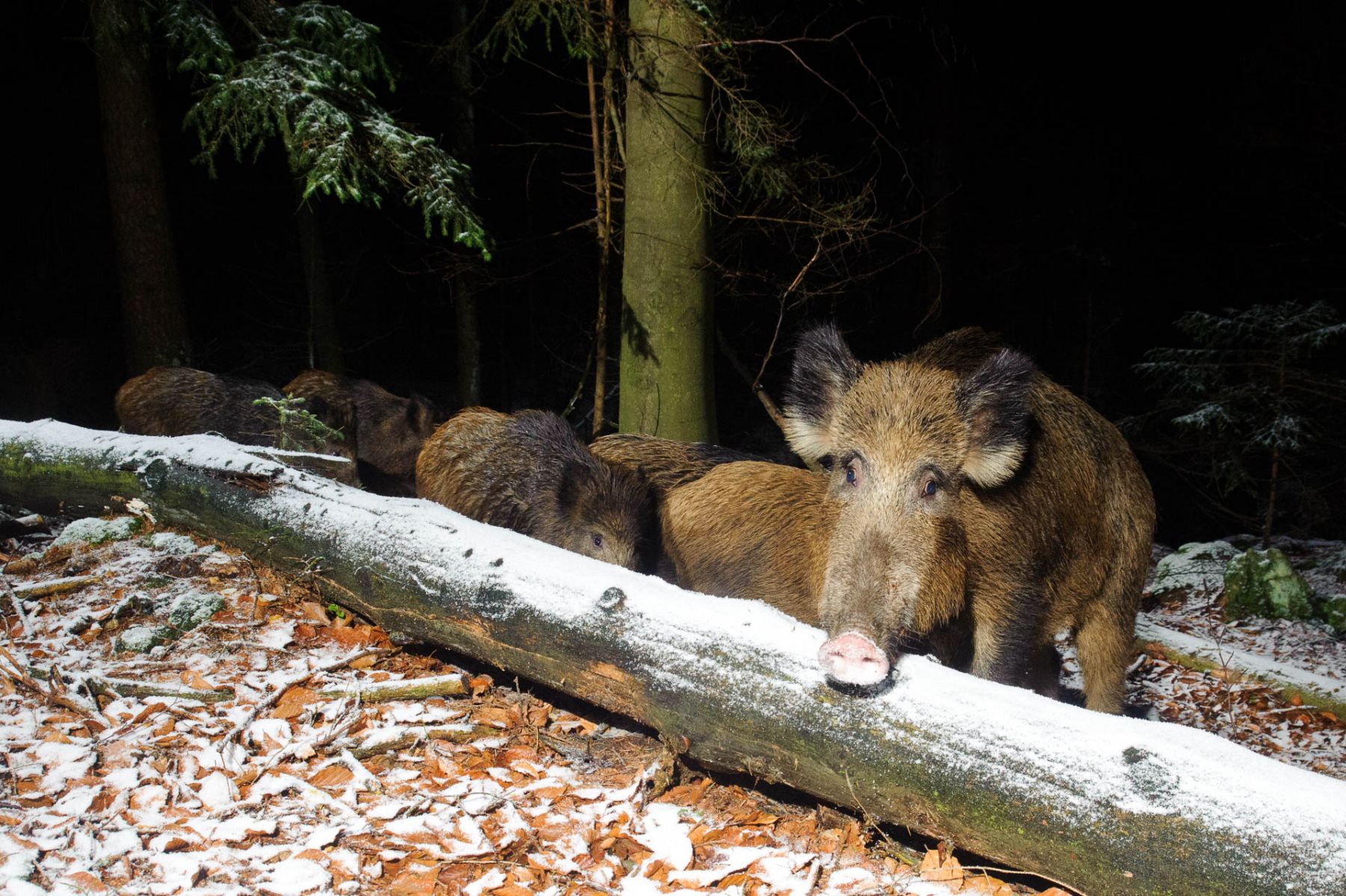 Gruppe von Wildschweinen im winterlichen Wald auf Erkundungstour.