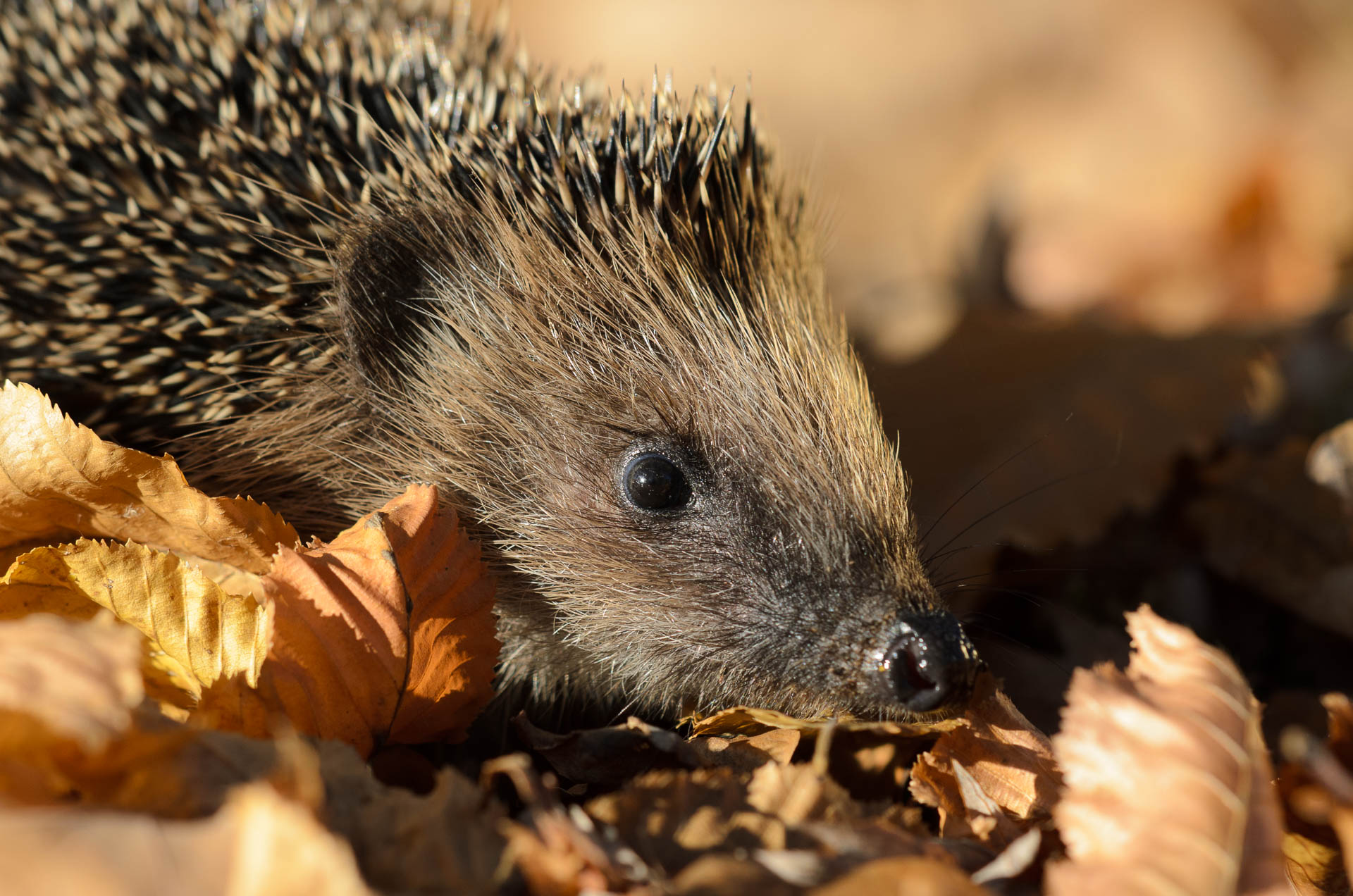 Ein Europäischer Igel liegt in herbstlichen Blättern und blickt zur Seite.