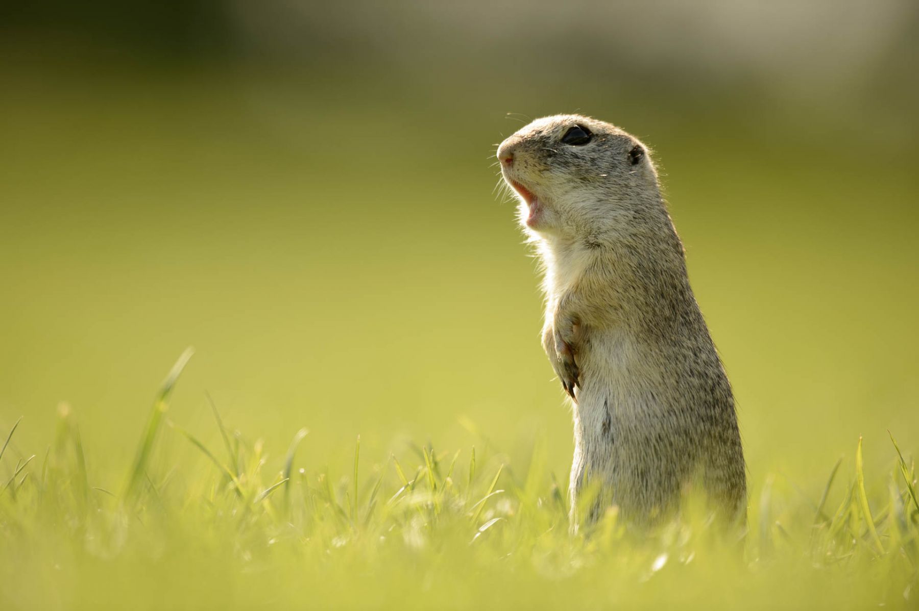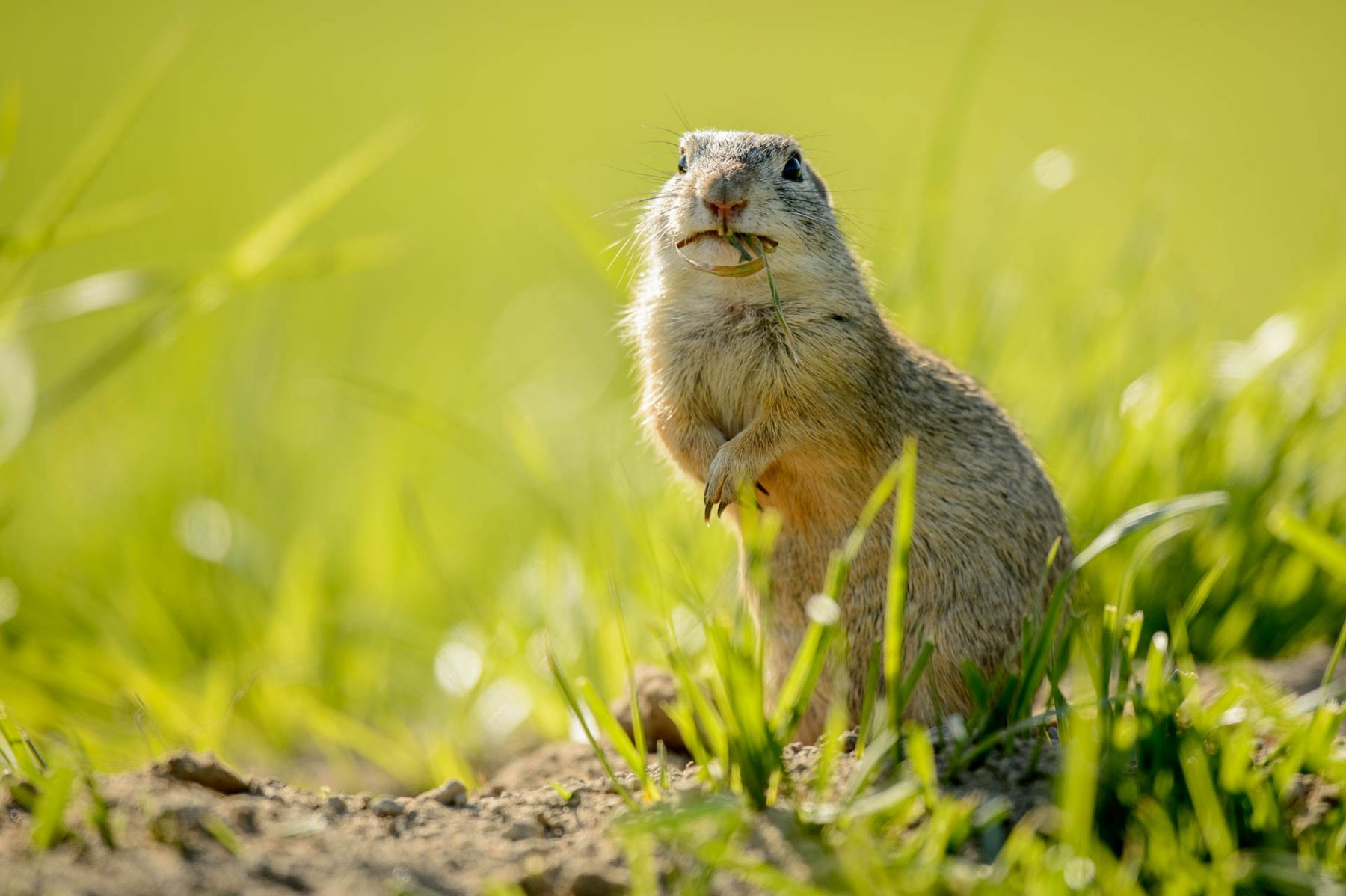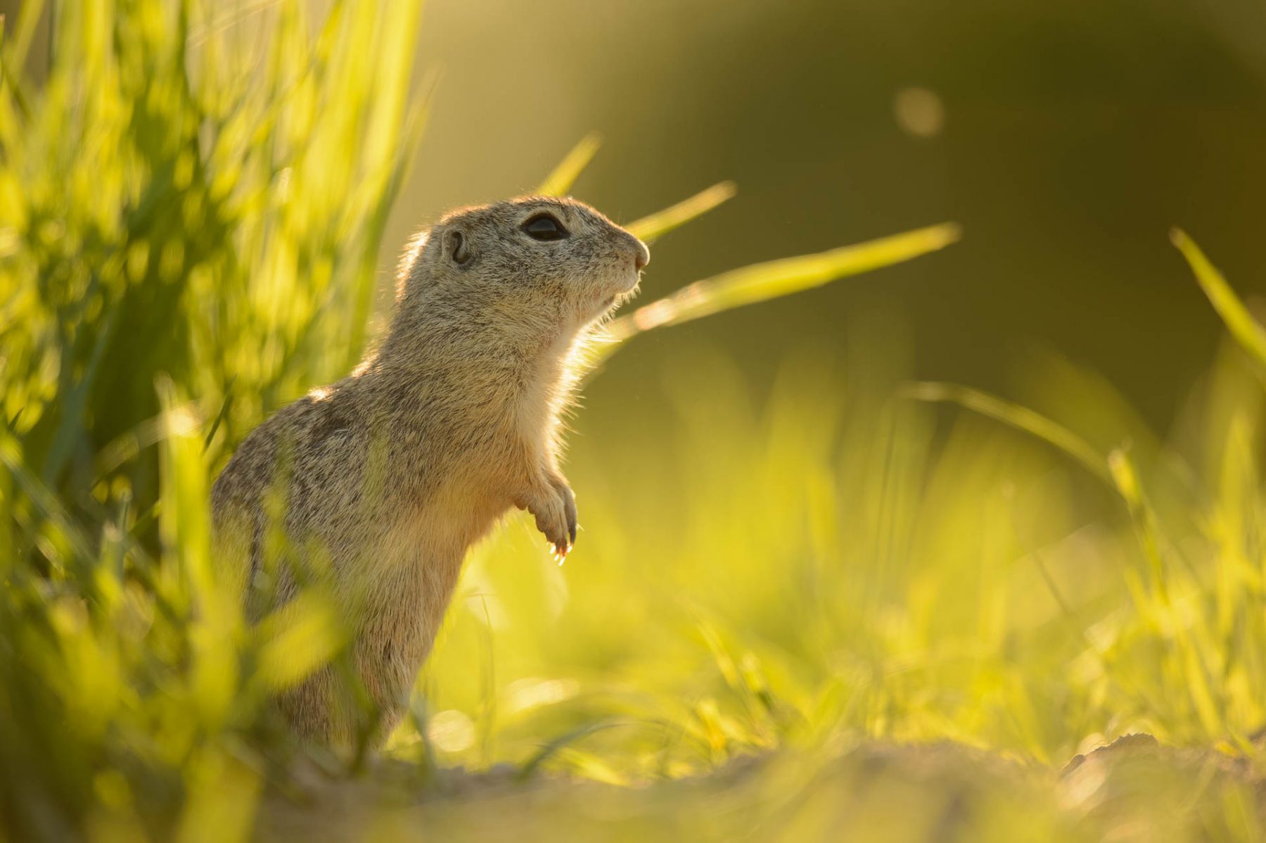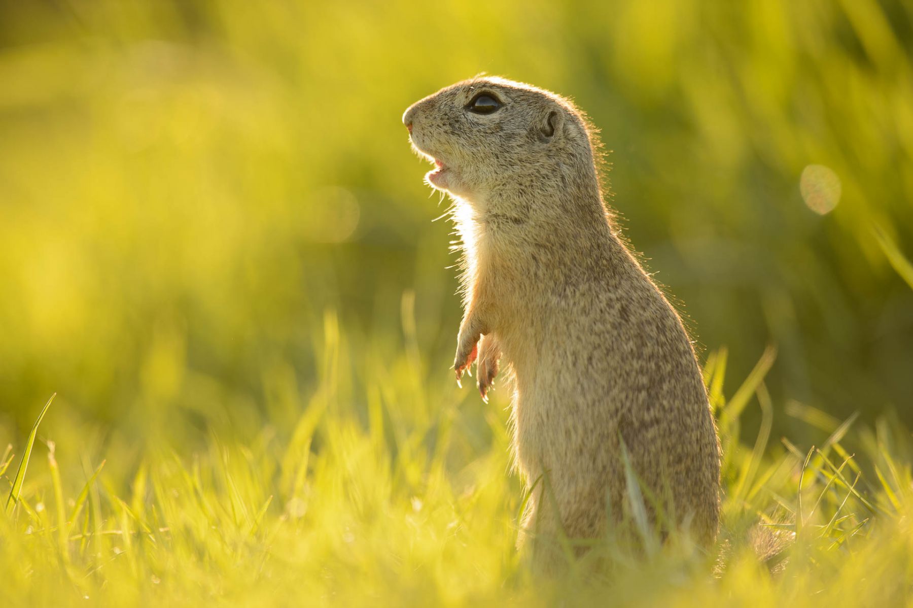Ein Murmeltier steht vor einer Bergkulisse im Sonnenuntergang.