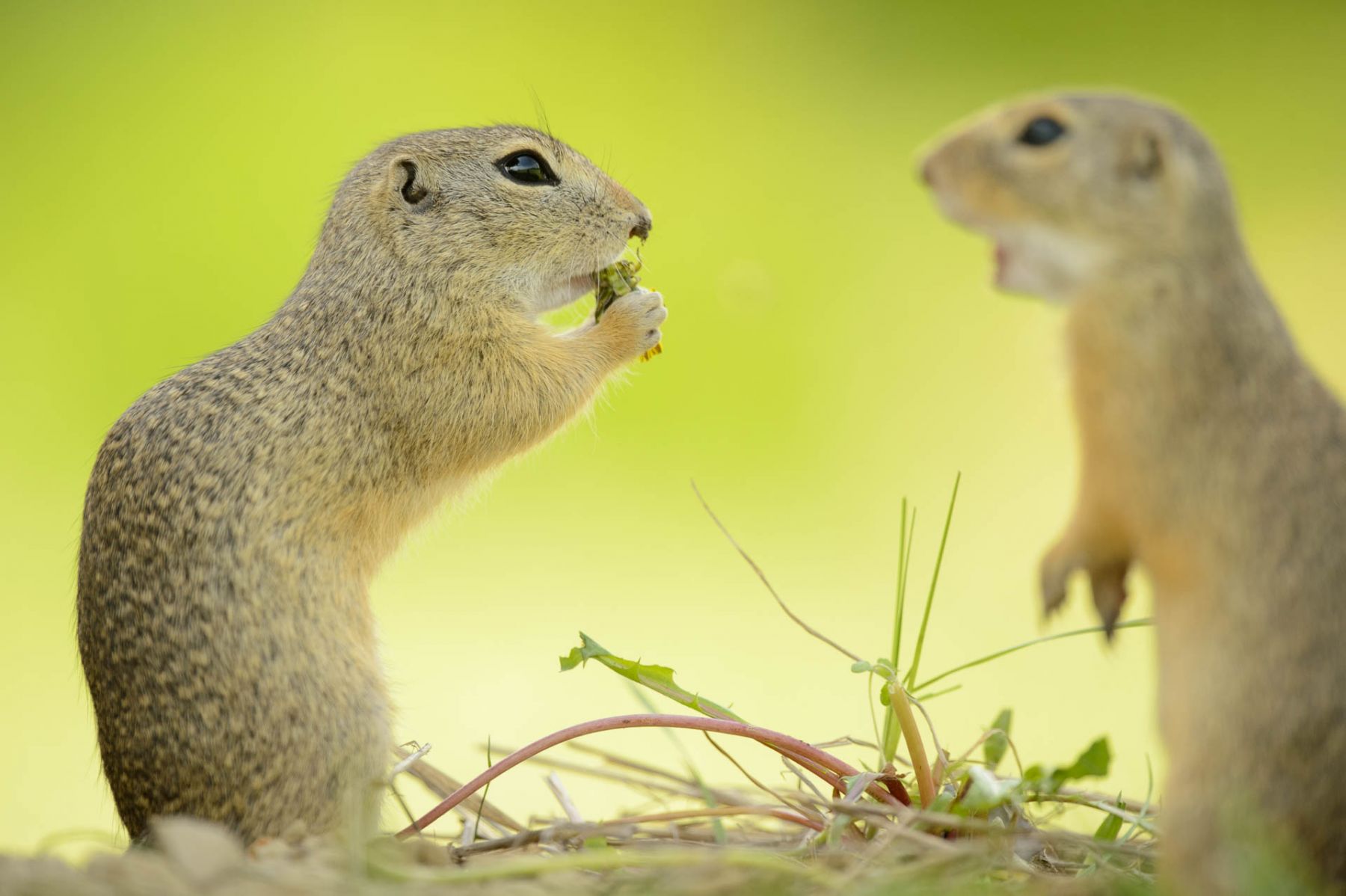 Zwei Alpenmurmeltiere interagieren auf einer alpinen Wiese.