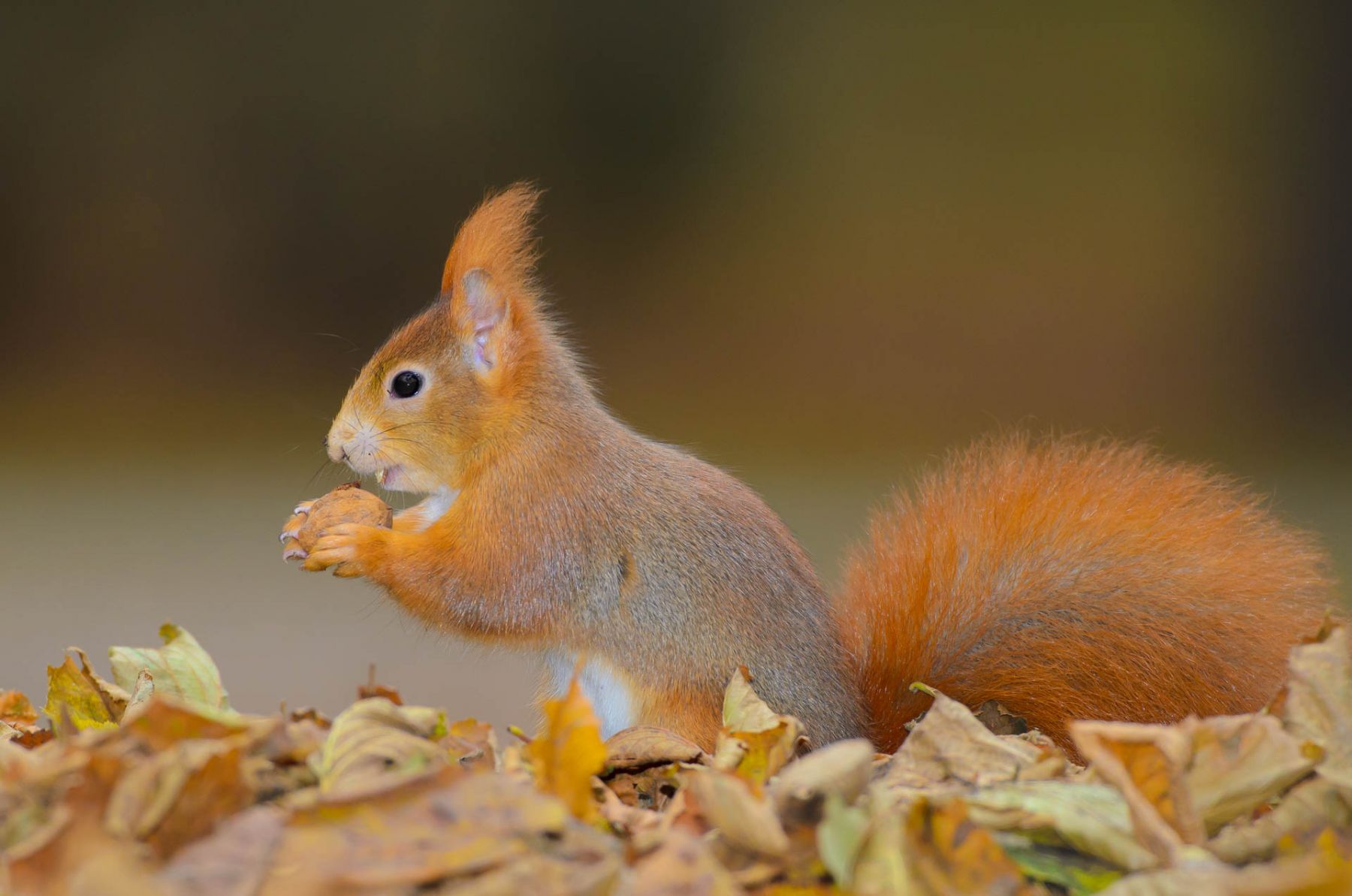 Europรคisches Eichhรถrnchen im bunten Herbstlaub, seitlich dargestellt.