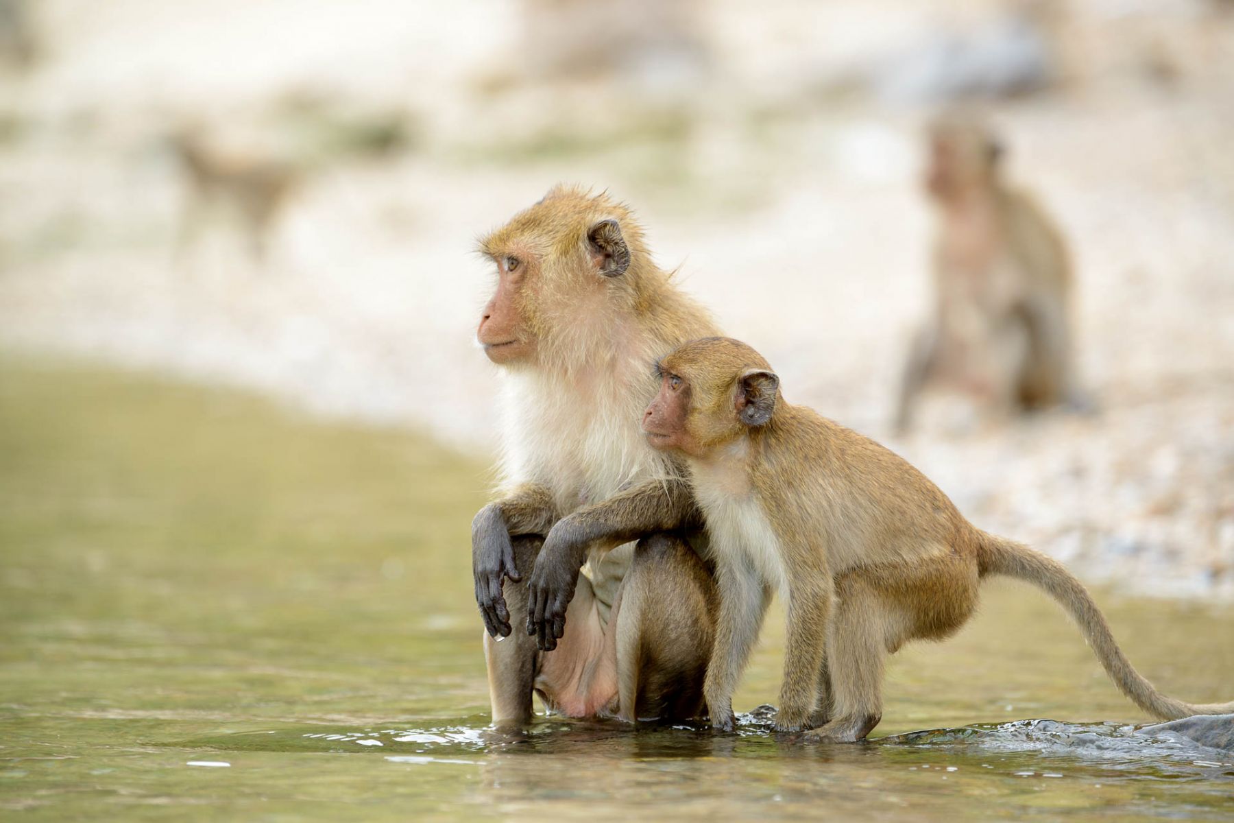 Zwei Javaneraffen am Ufer eines Gewässers in einer tropischen Umgebung.