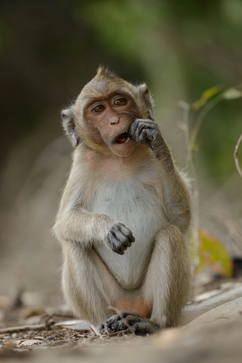 Langschwanz-Makak sitzt nachdenklich und betrachtet seine Umgebung.